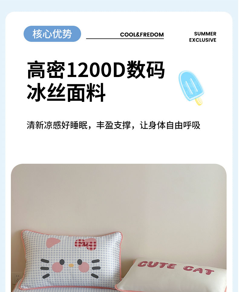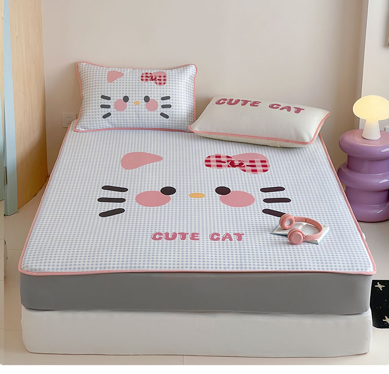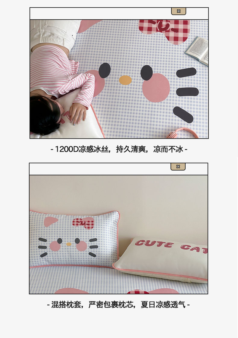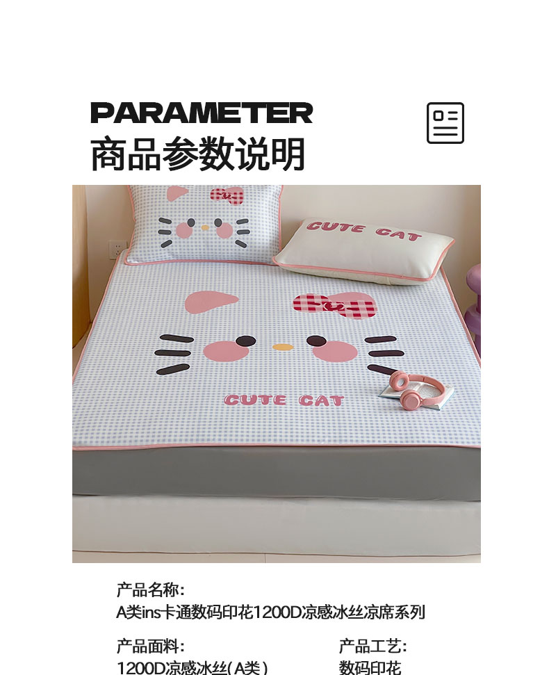 • 91家纺网 家纺一手货源 找家纺 桃子家居 2026新款A类ins博主卡通数码印花高级品质撞色中分子1200D冰感丝凉感席冰丝三件套平铺床笠系列 冰感席混搭-可爱猫咪