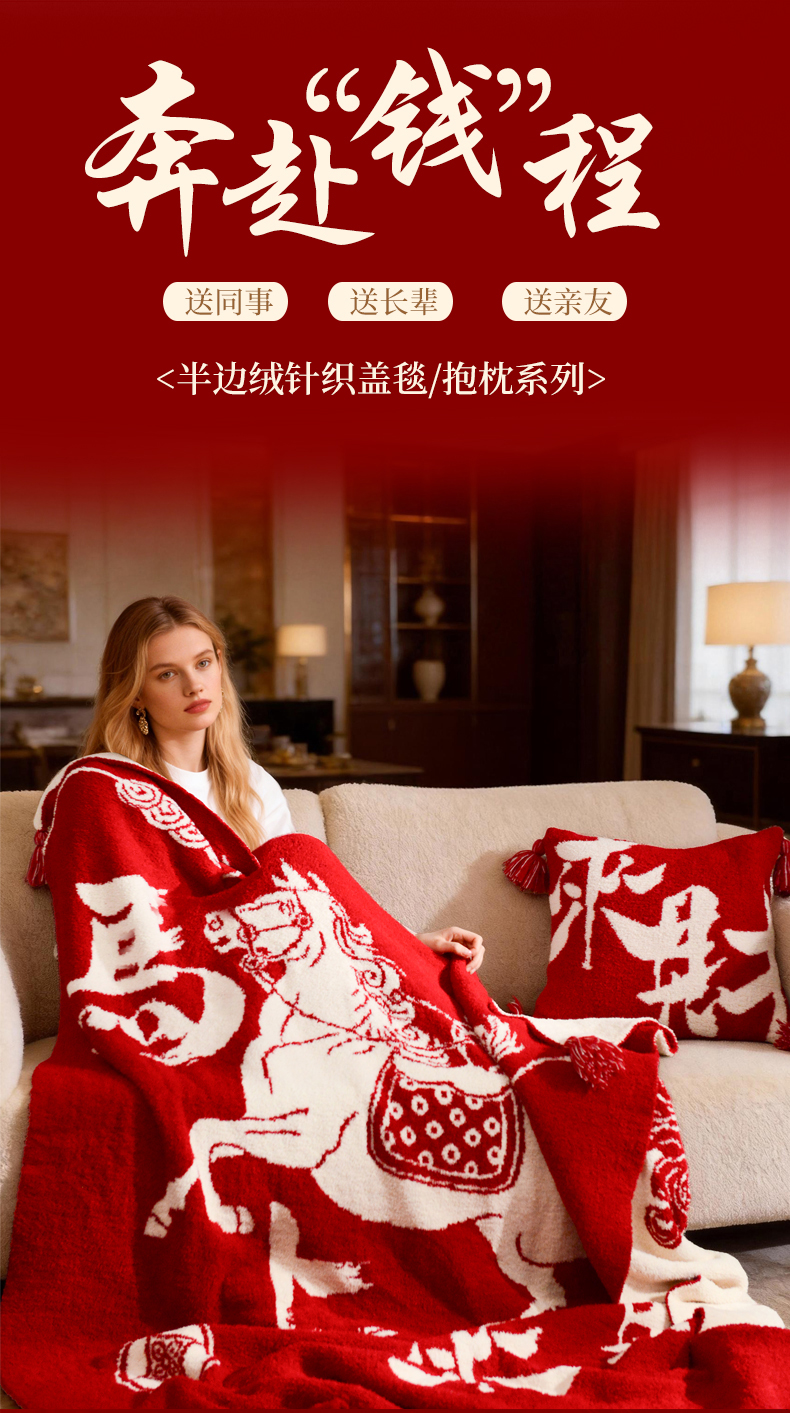 (总)苏艺针织盖毯 2026新款A类半边绒国风祥瑞针织毯披肩毛毯多功能盖毯送礼礼物,马上来财,马上有钱,马上来财抱枕套,礼盒,枕芯