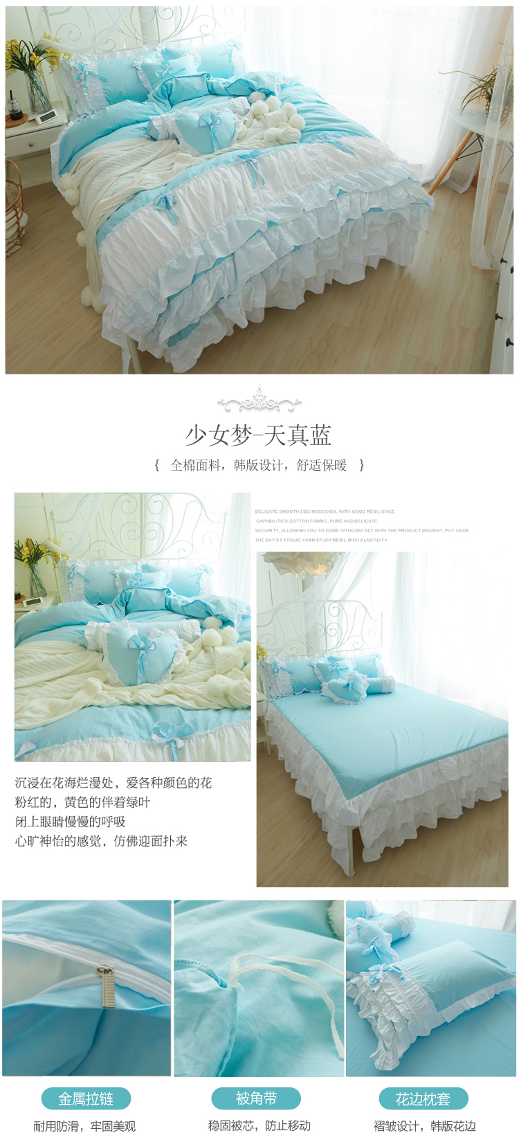 淑女公社 韩版纯棉床裙款四件套-微微公主系列 蓝色,蓝色
