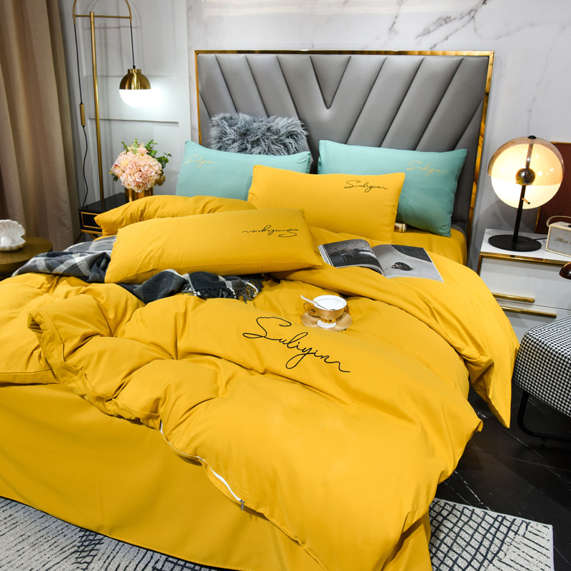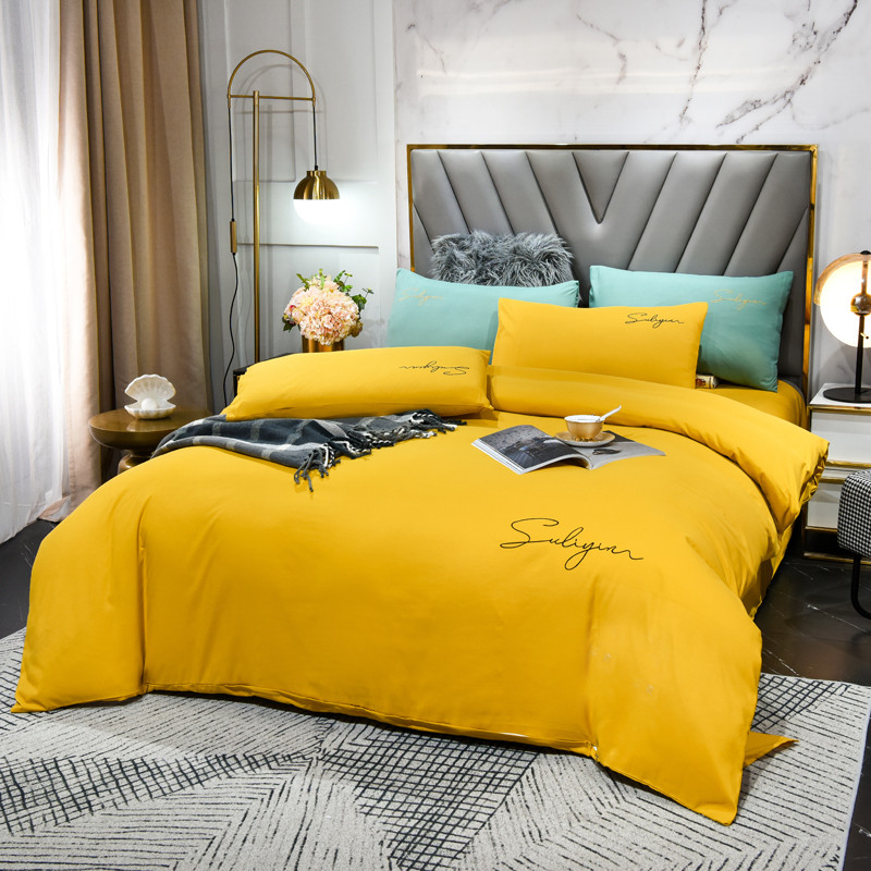孟鑫家纺 2021新款加厚纯色刺绣磨毛四件套 金秋黄