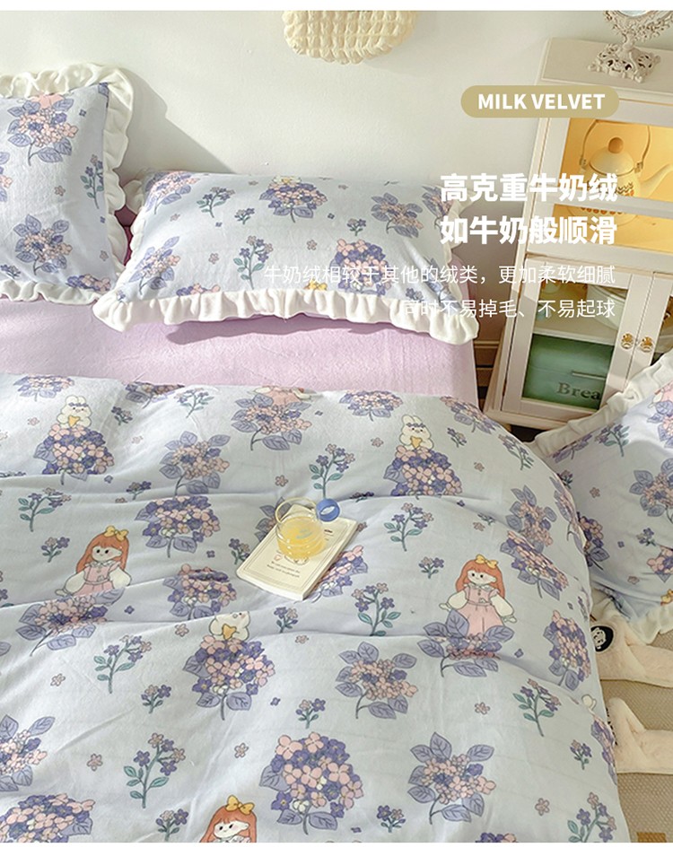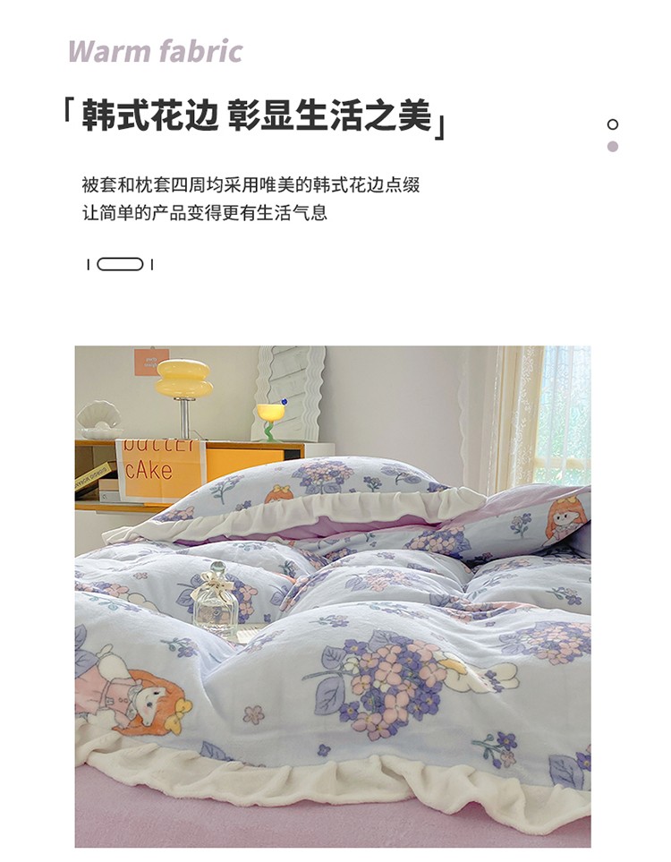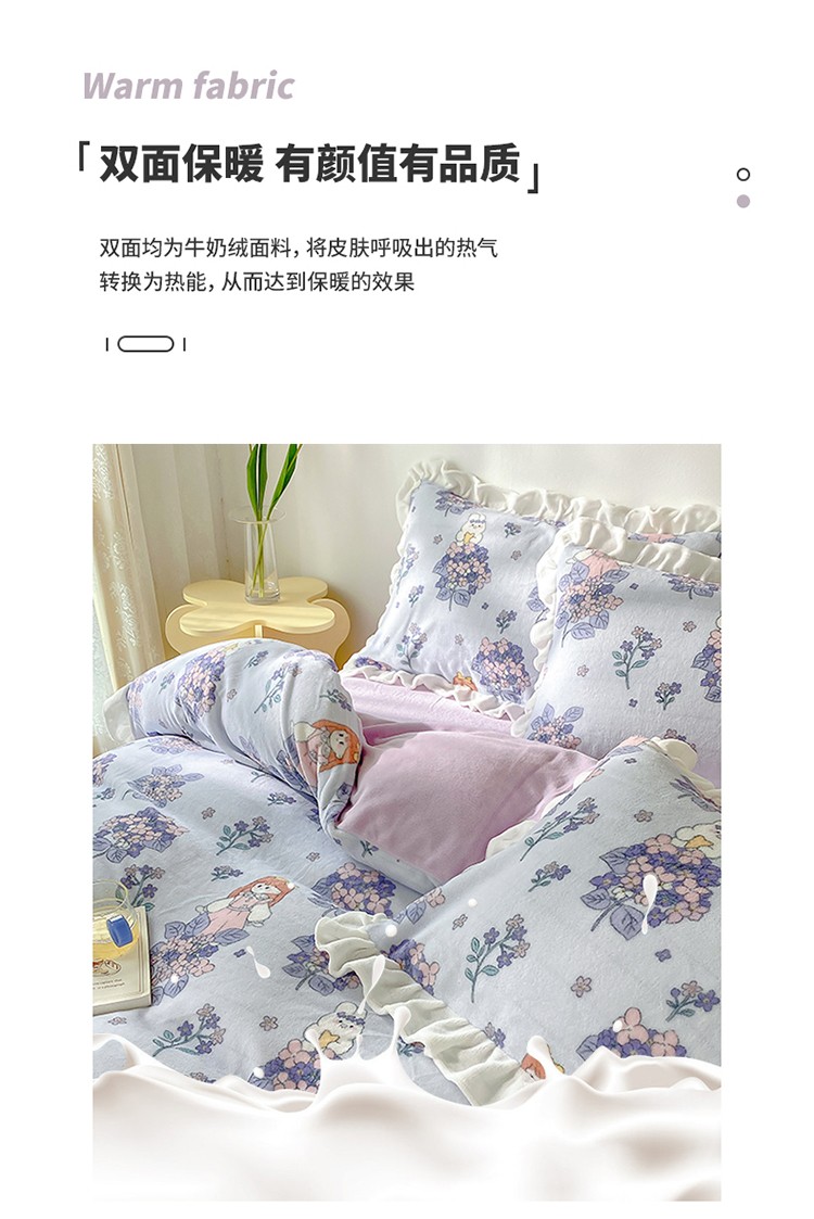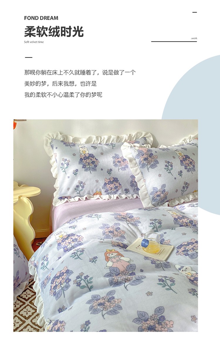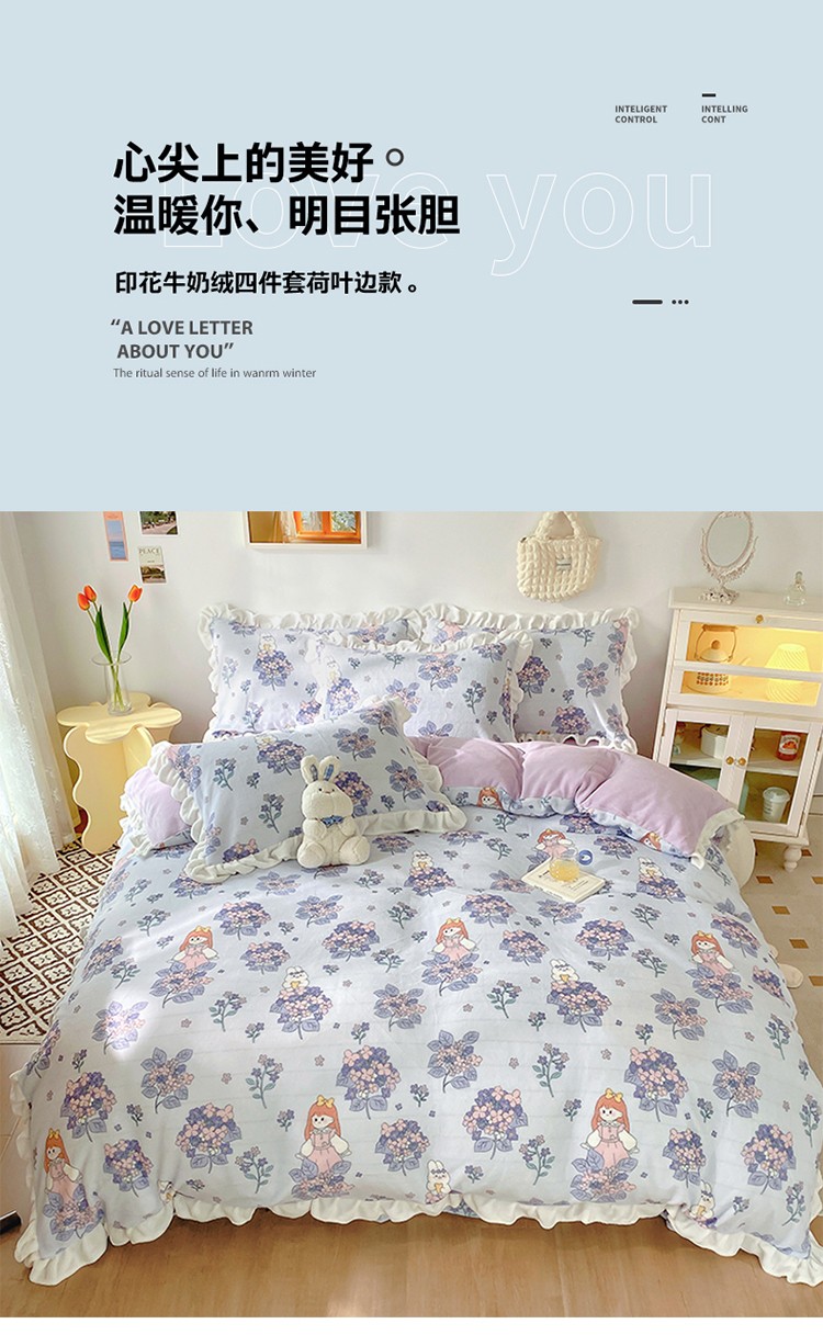 呗旺鹿2022ykk拉链荷叶边印花牛奶绒四件套法莱绒梦想绽放