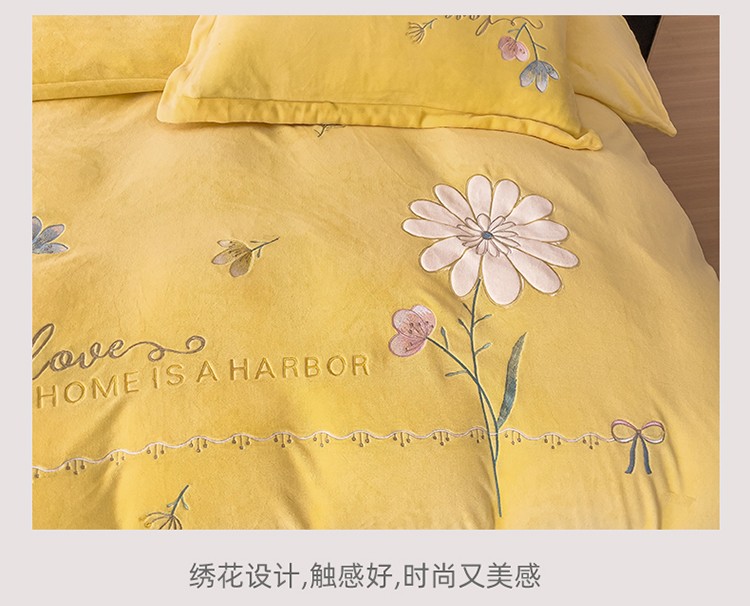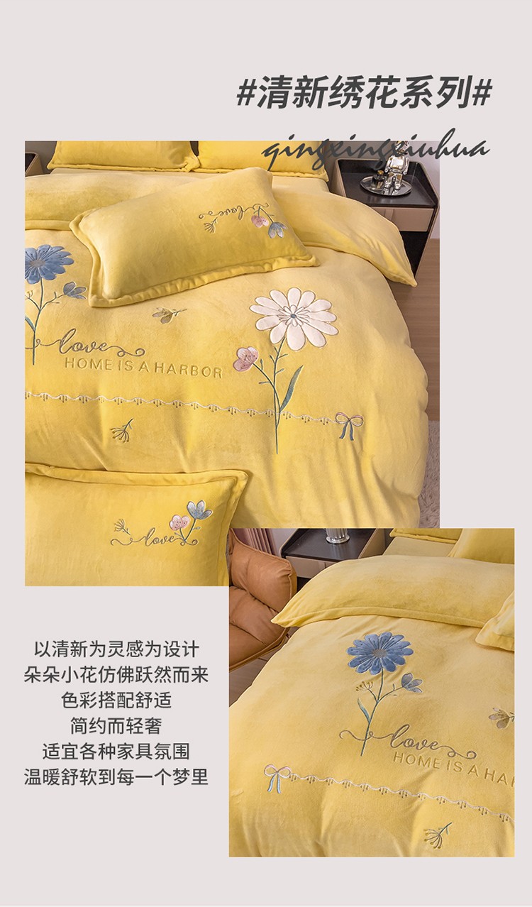 总 金米诺 直播供货纯色牛奶绒绣花四件套小清新床裙式 初遇