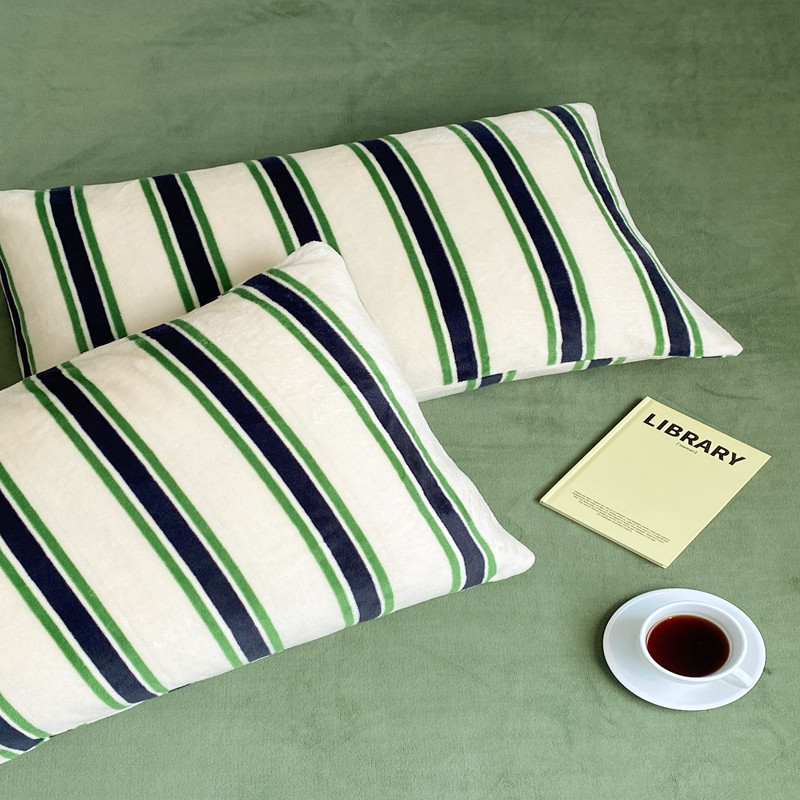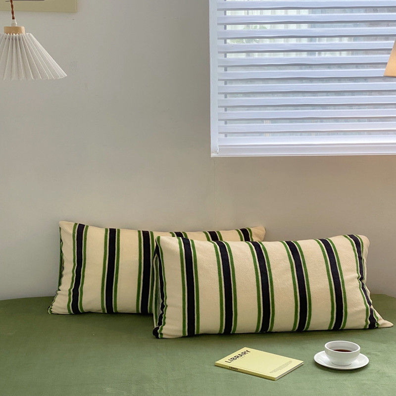 桃喜 2022新款牛奶绒条纹枕套 中古绿黑条