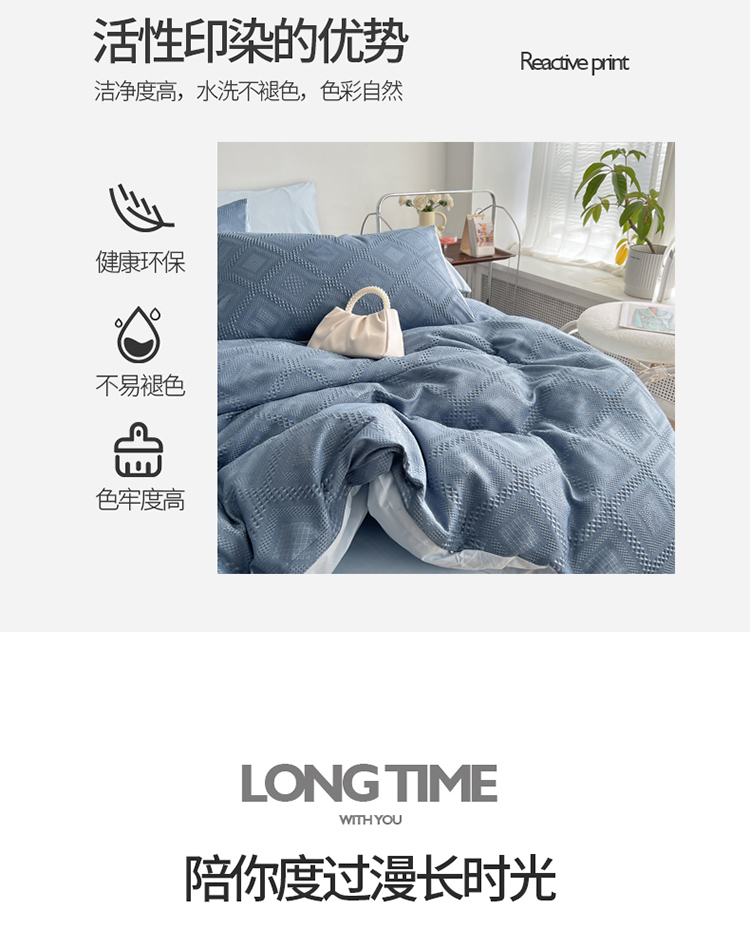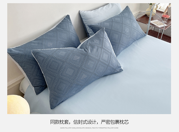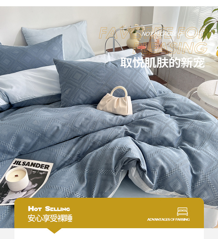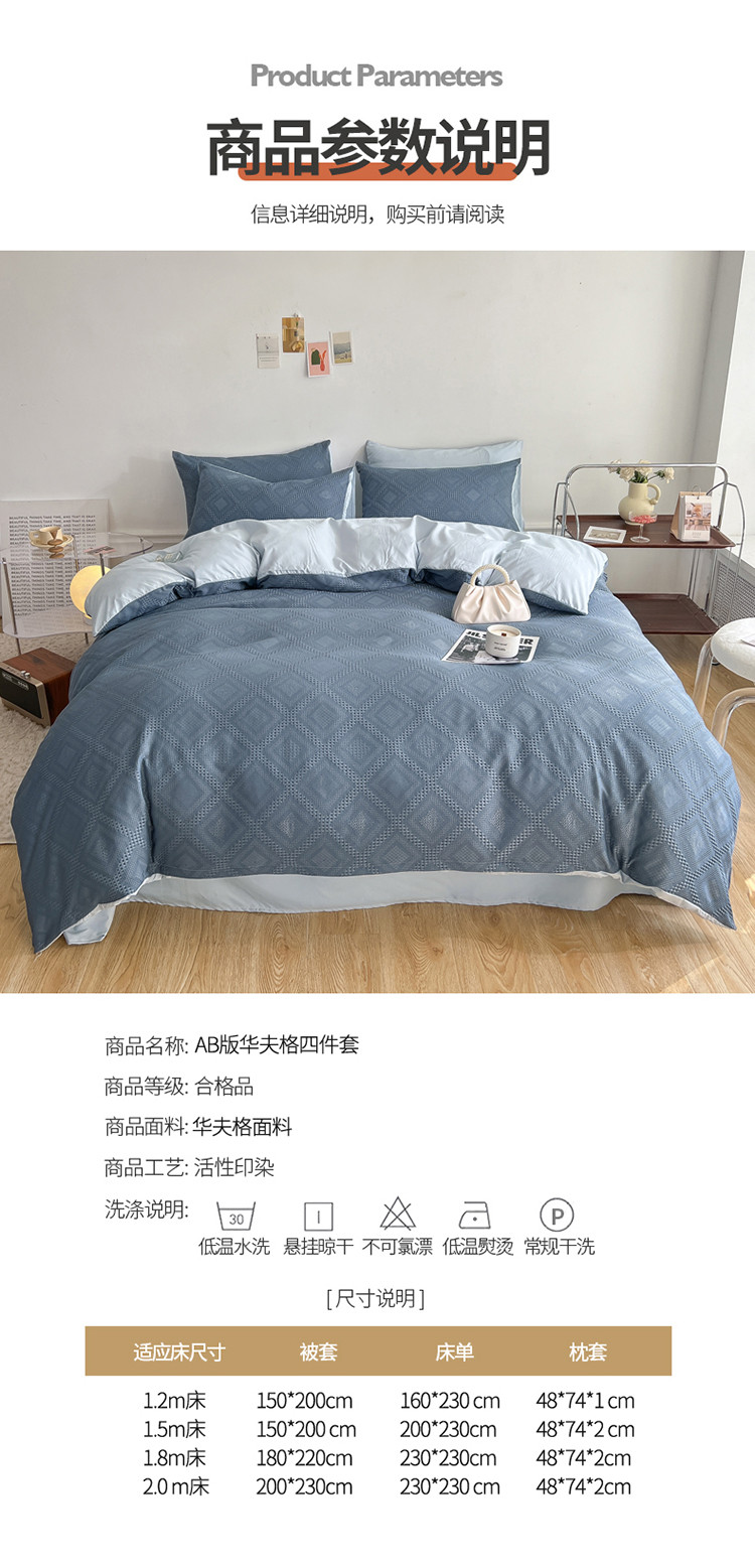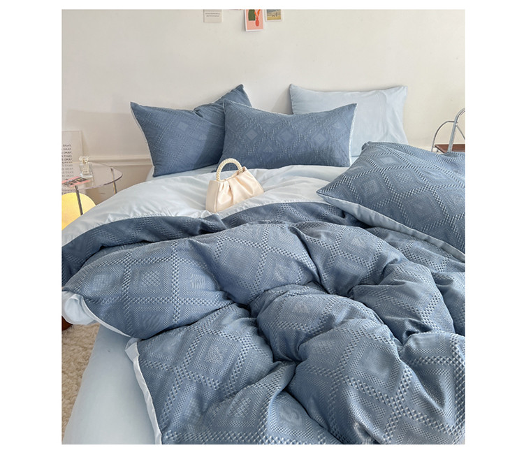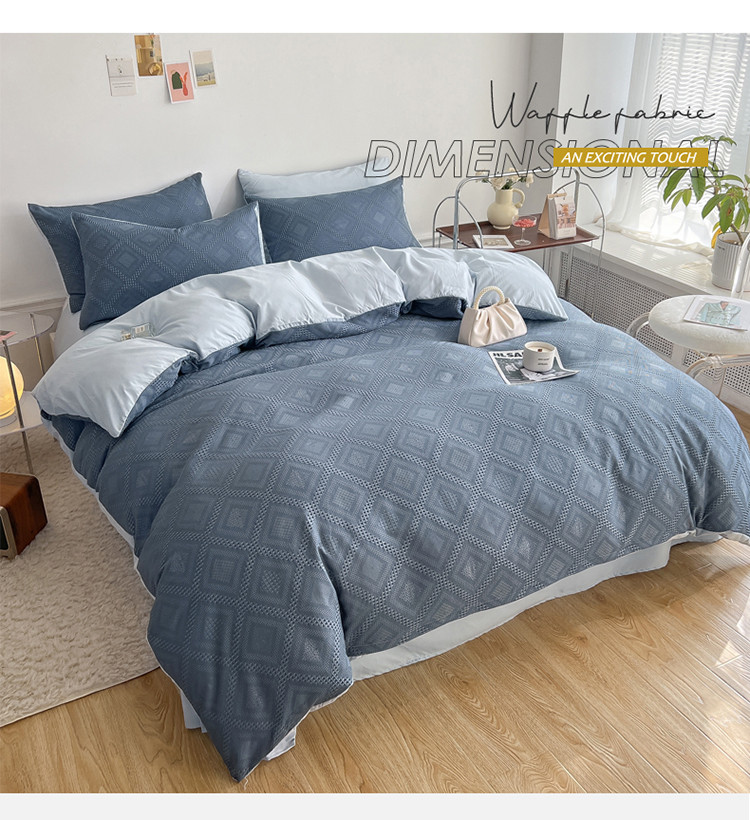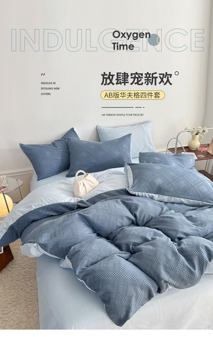 商品名称:米粒 2022直播爆款纯色AB版华夫格四件套磨毛水洗棉 牛仔蓝