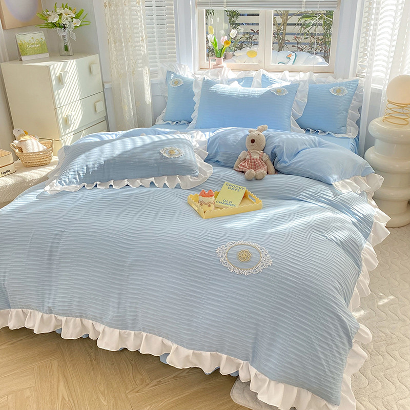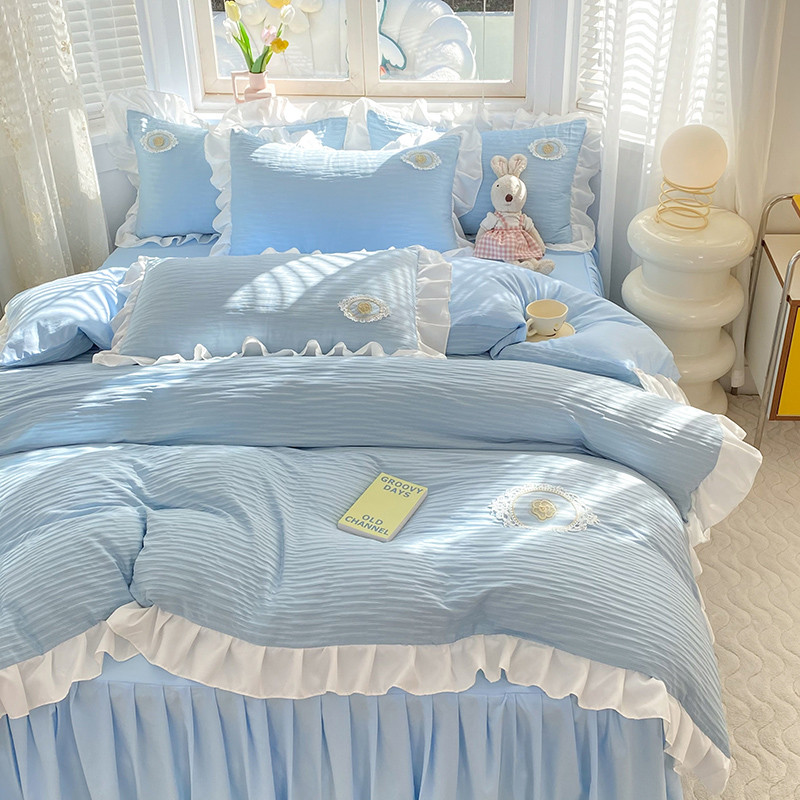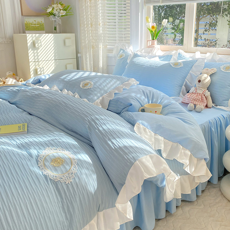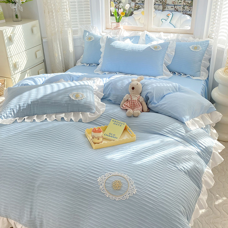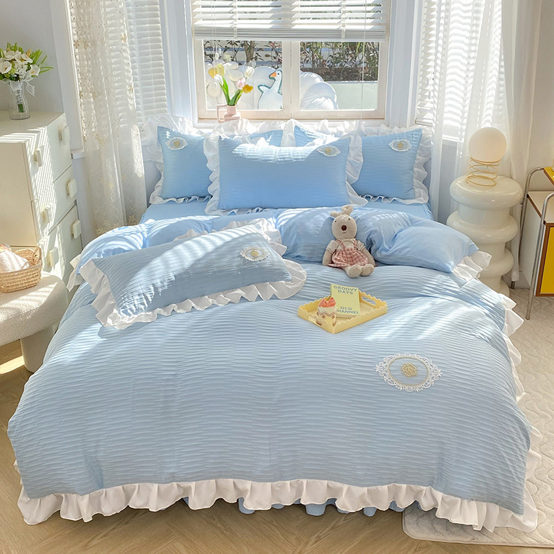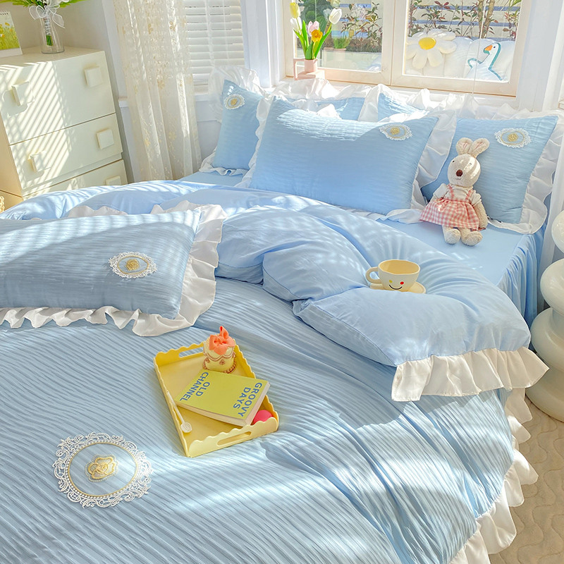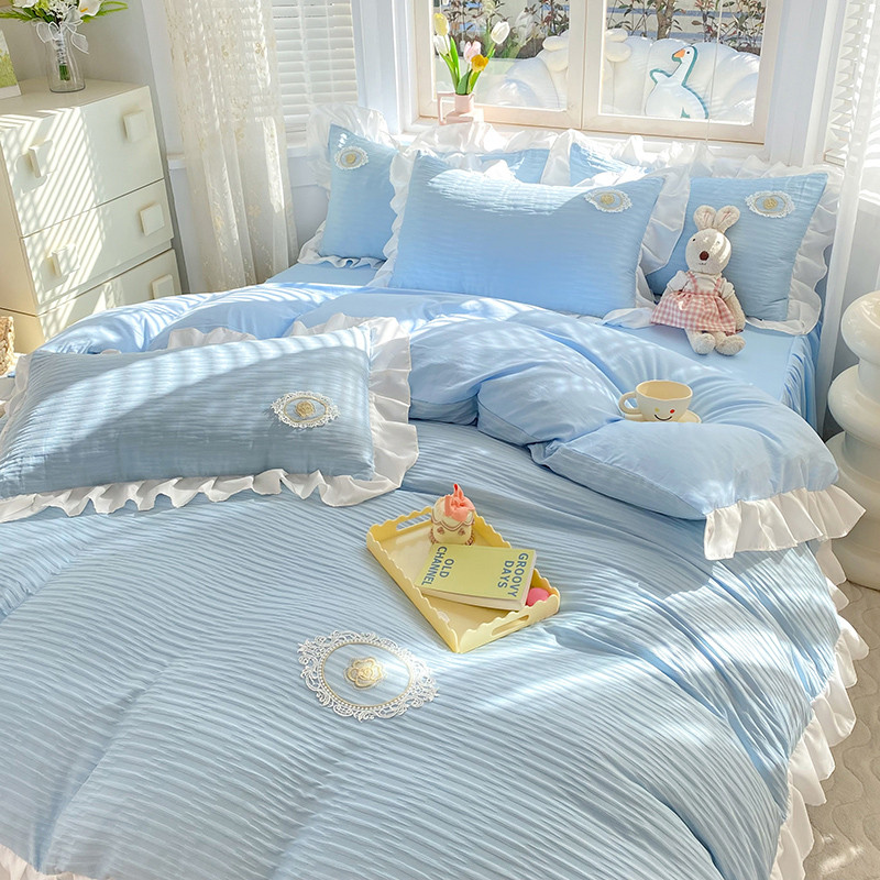 当前位置: 91家纺网 > 商品网购 > 床品套件 > 四件套 > 全棉普通四件套 > 韩约 2023新款 韩约泡泡纱仙叶系列四件套 千叶花边款(天空兰)