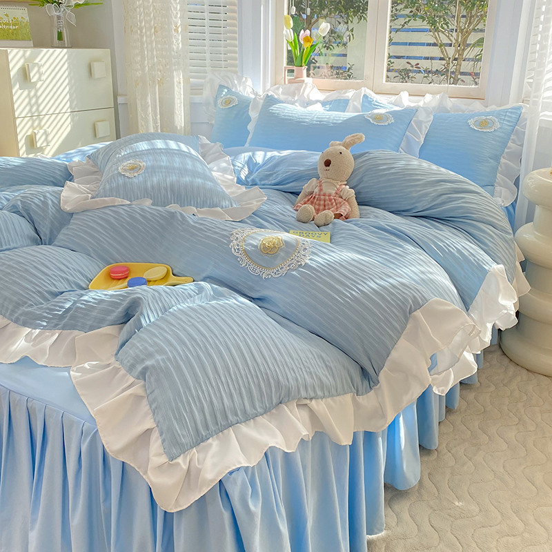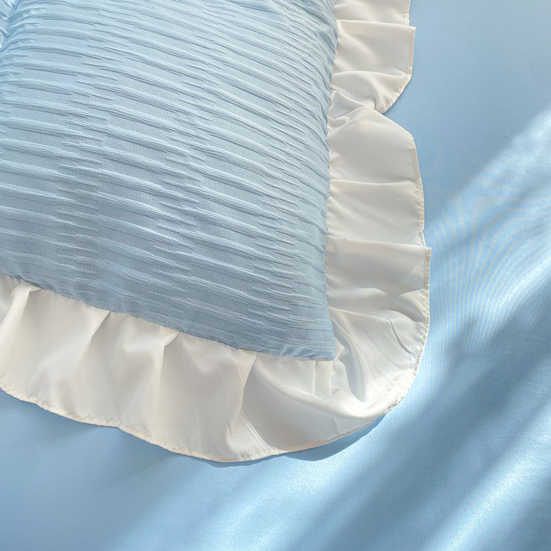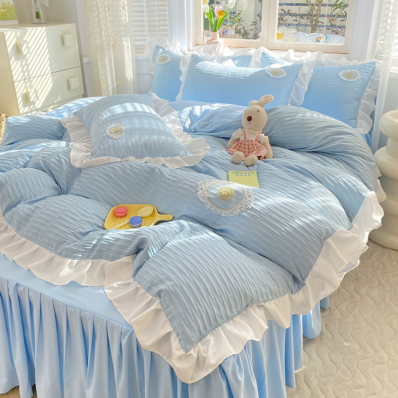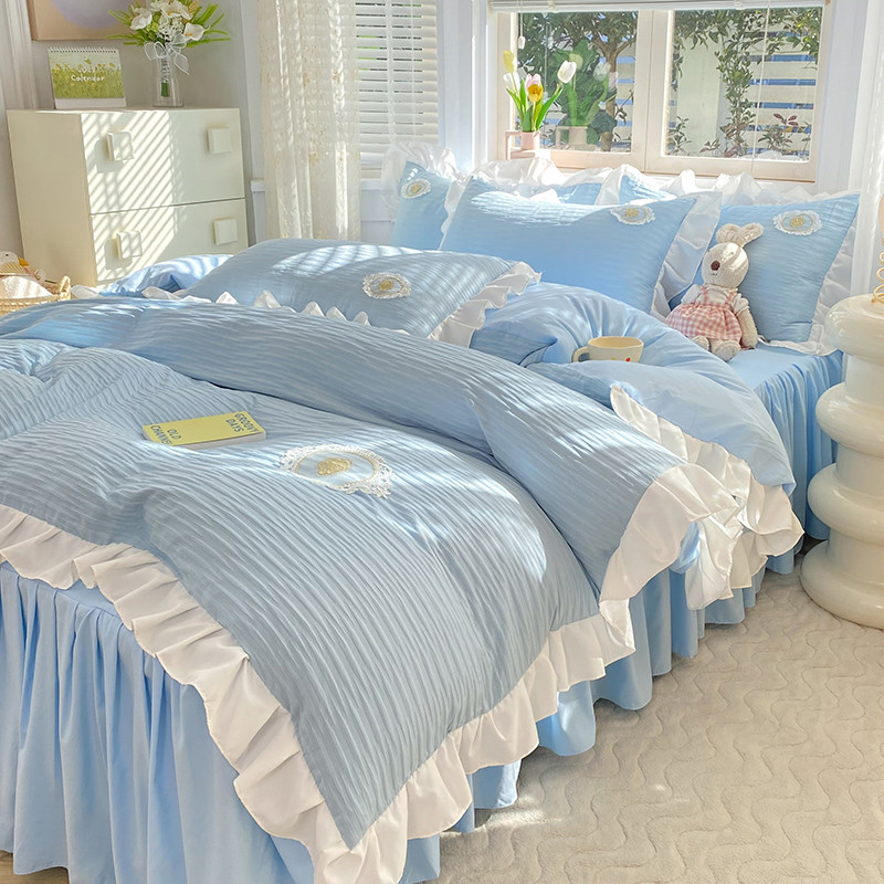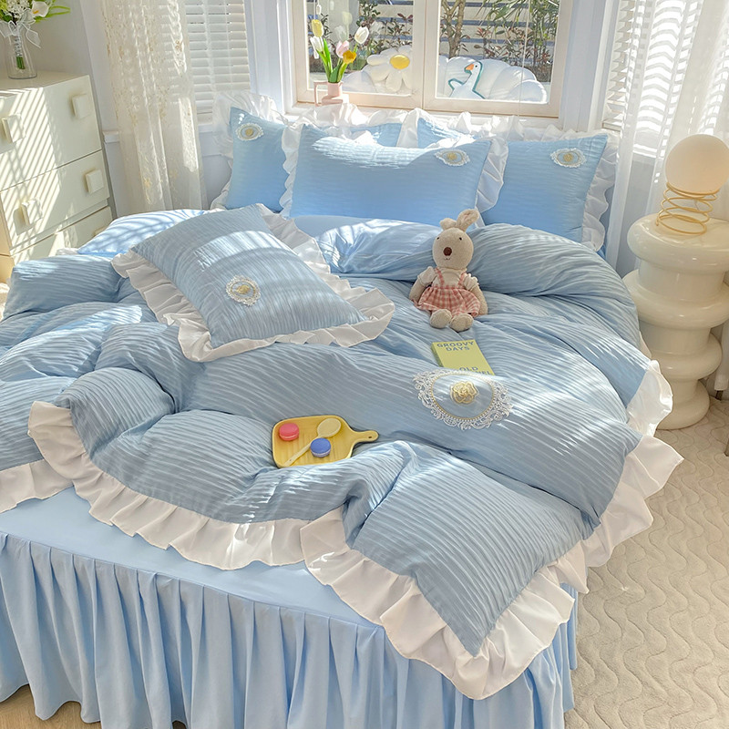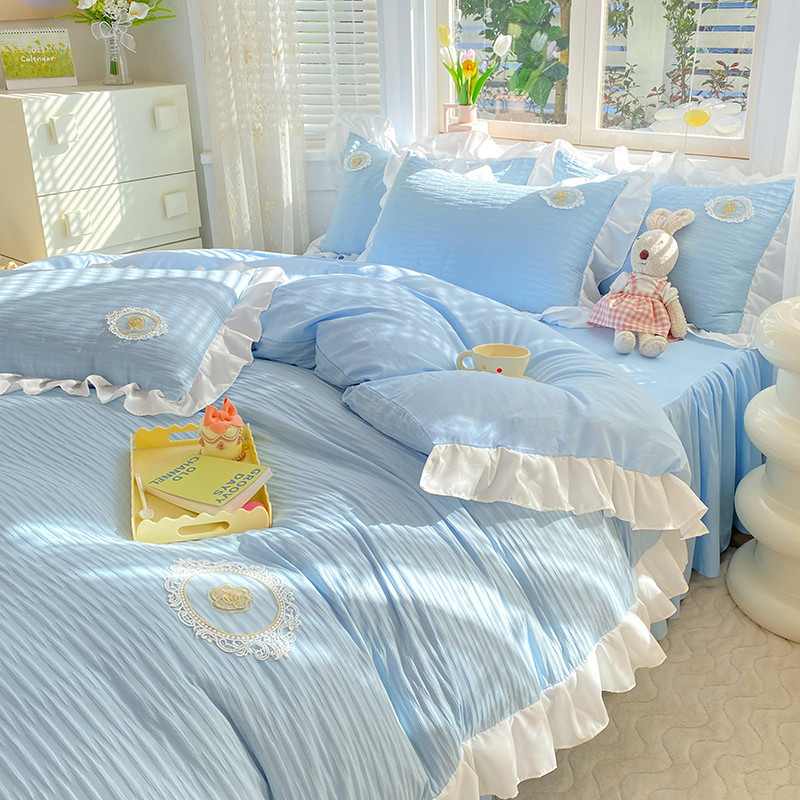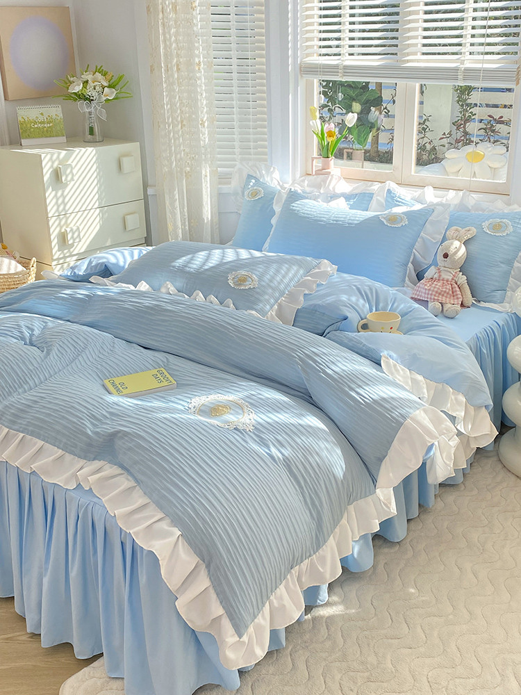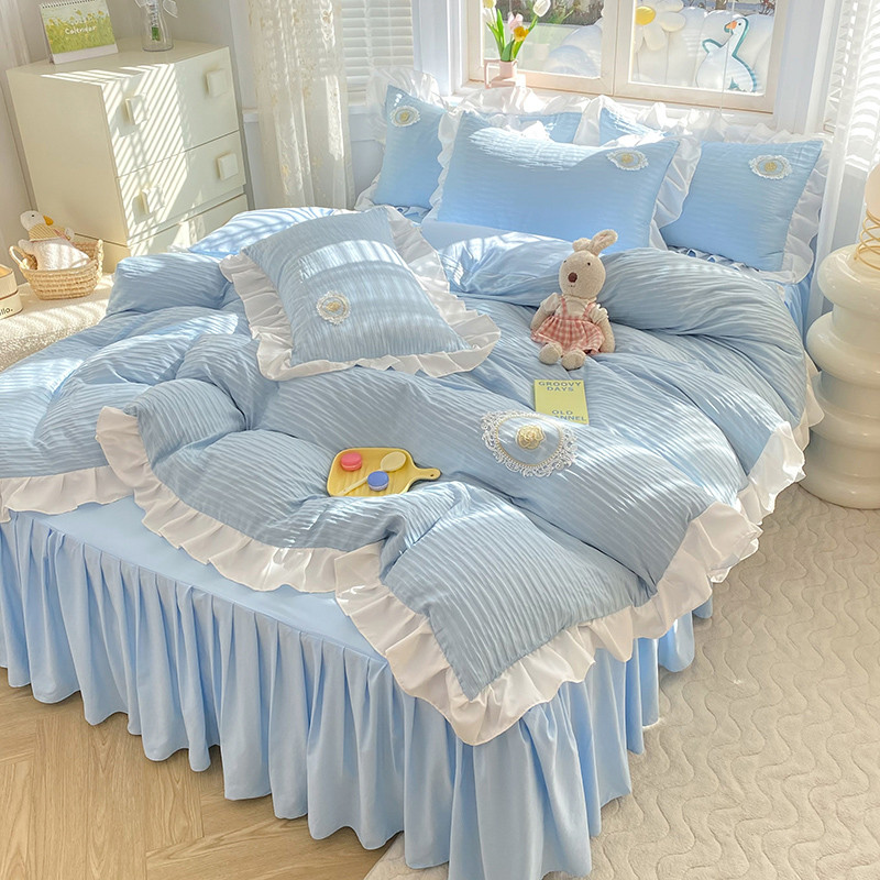 当前位置: 91家纺网 > 商品网购 > 床品套件 > 四件套 > 全棉普通四件套 > 韩约 2023新款 韩约泡泡纱仙叶系列四件套 千叶花边款(天空兰)