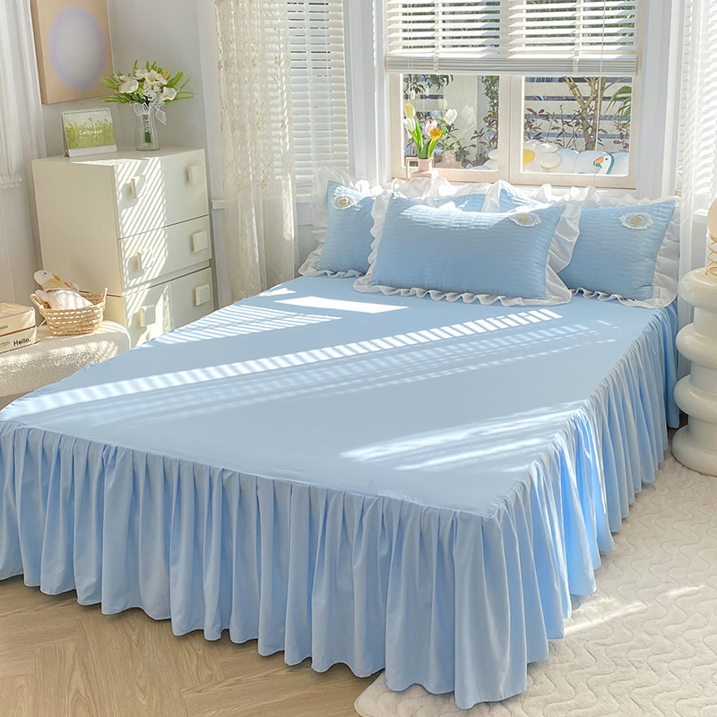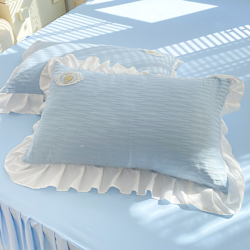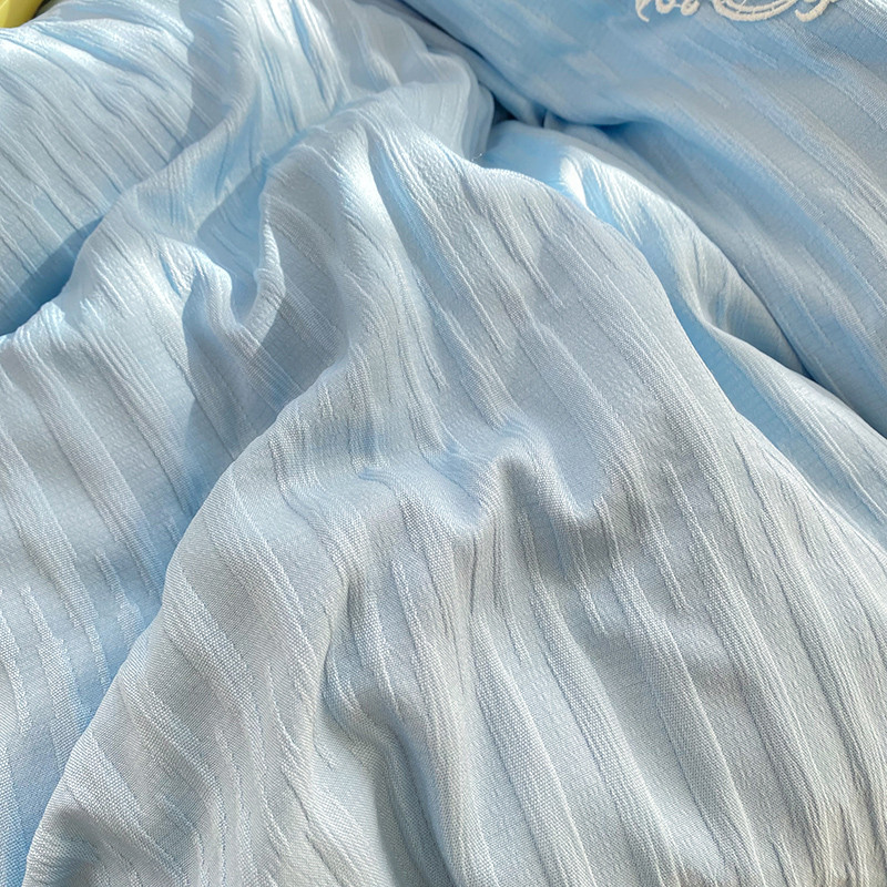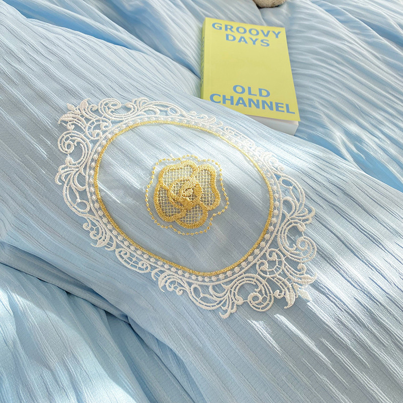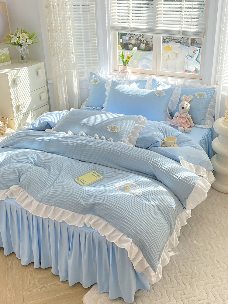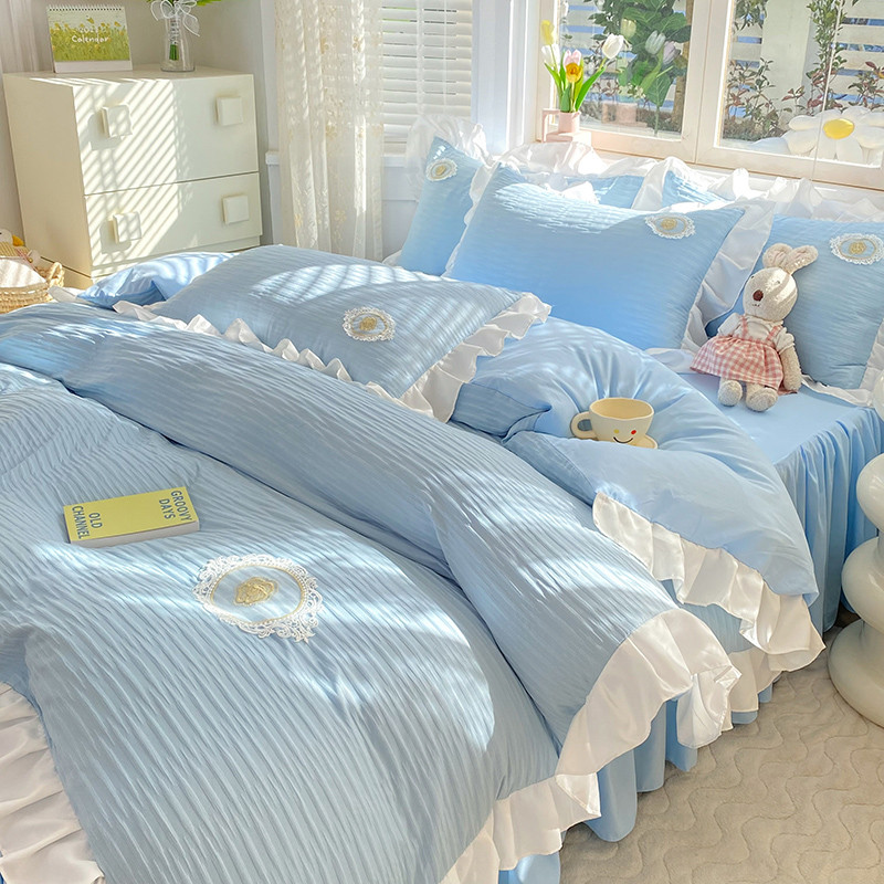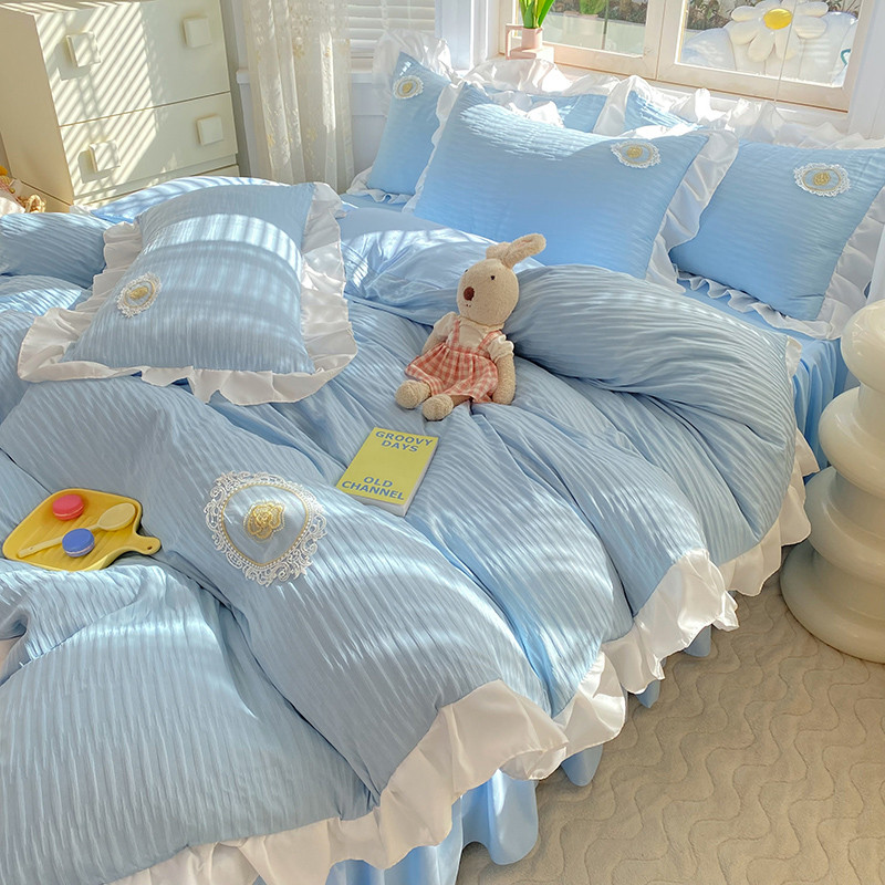 当前位置: 91家纺网 > 商品网购 > 床品套件 > 四件套 > 全棉普通四件套 > 韩约 2023新款 韩约泡泡纱仙叶系列四件套 千叶花边款(天空兰)
