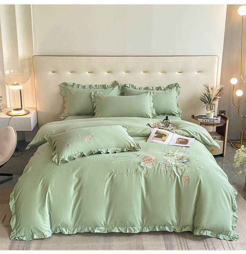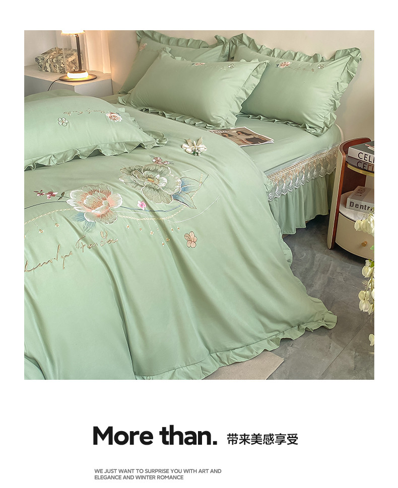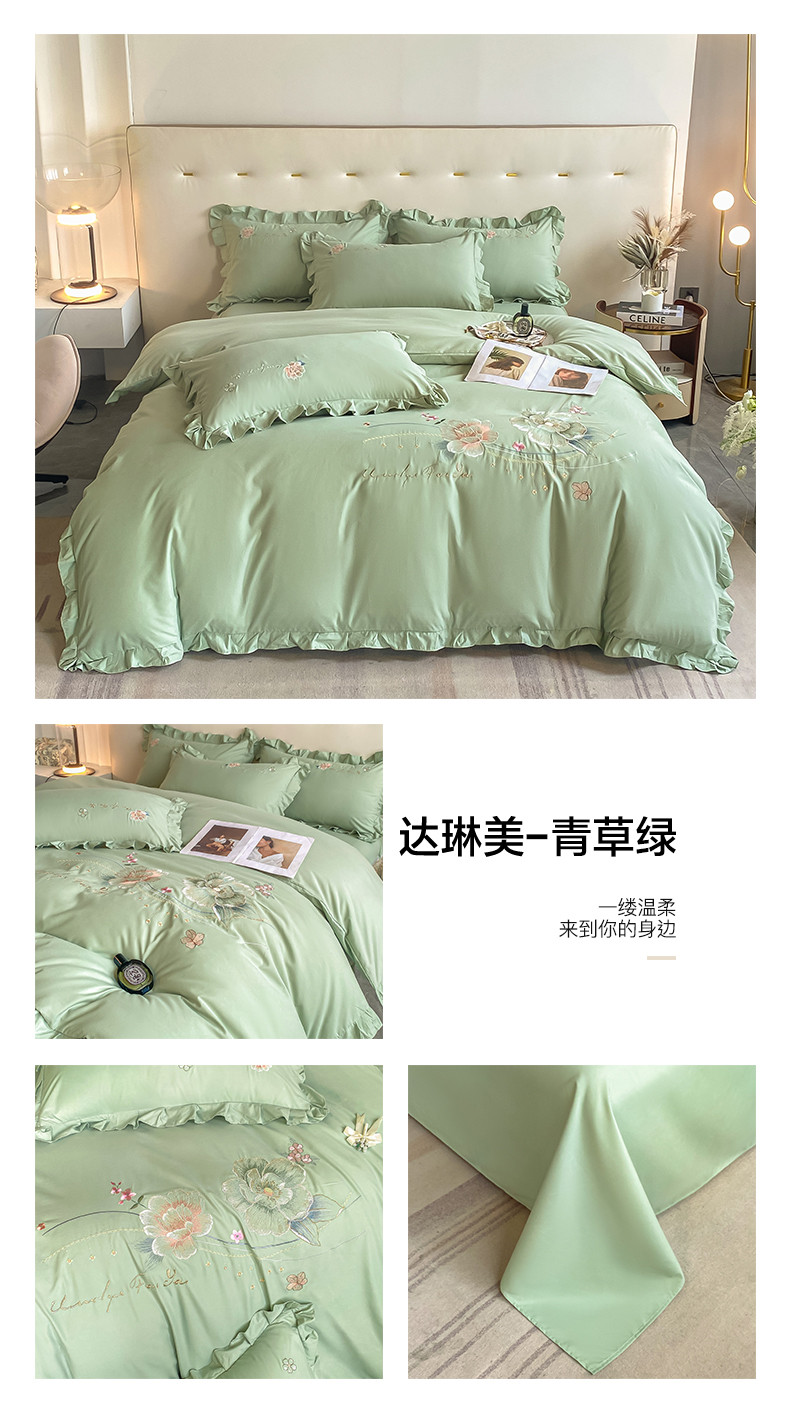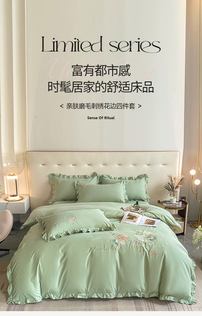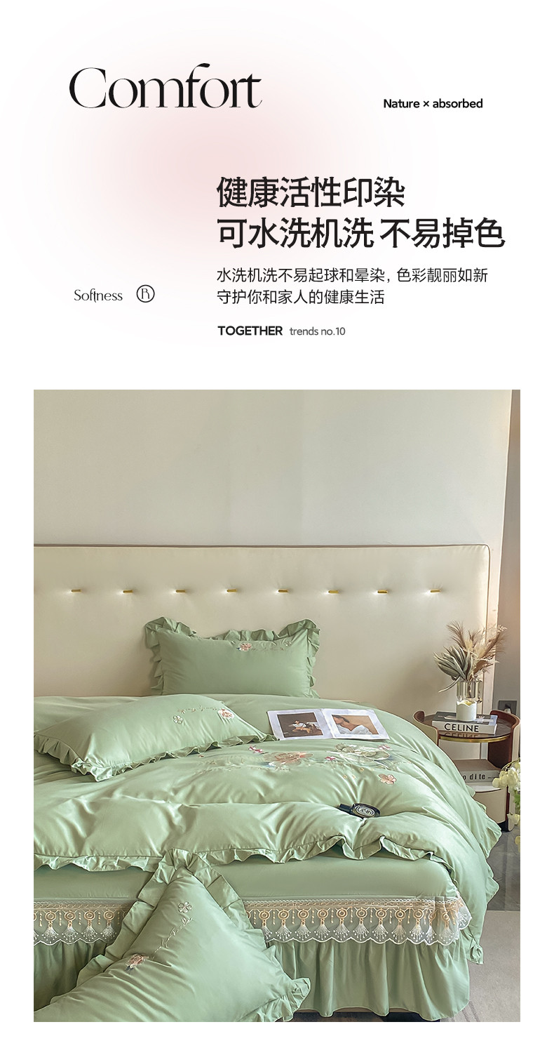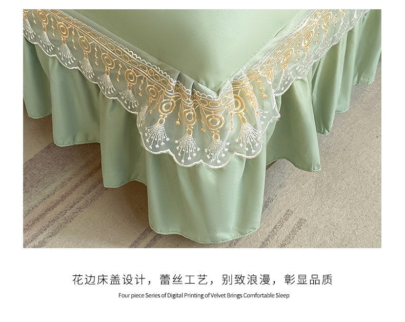 当前位置: 91家纺网 > 商品网购 > 床品套件 > 四件套 > 普通磨毛四件套 > 2023新款韩版亲肤磨毛刺绣蕾丝床裙床单如意系列四件套 达琳美-青草绿