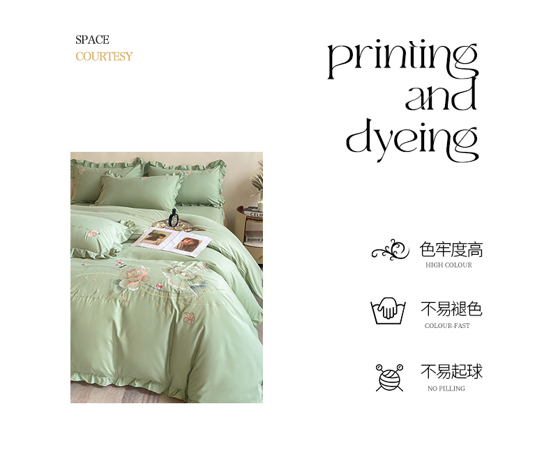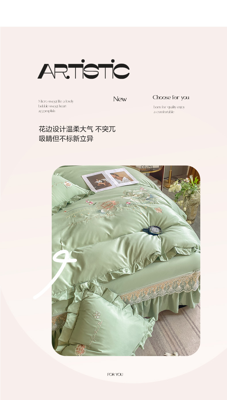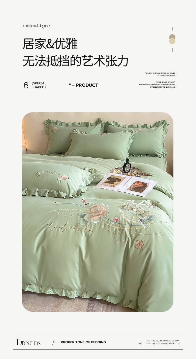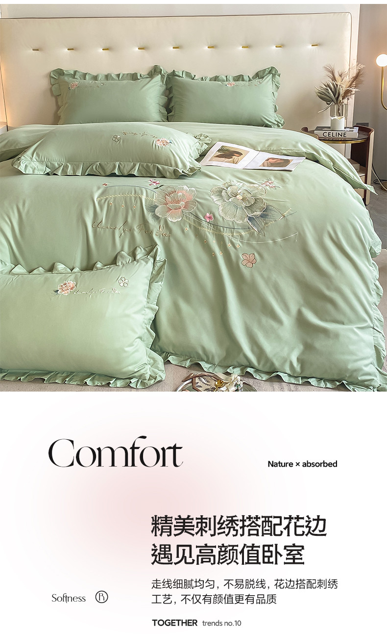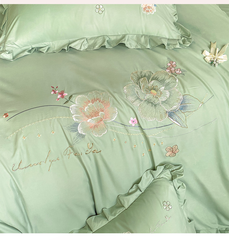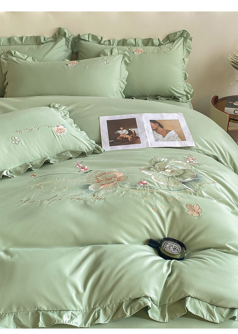 当前位置: 91家纺网 > 商品网购 > 床品套件 > 四件套 > 普通磨毛四件套 > 2023新款韩版亲肤磨毛刺绣蕾丝床裙床单如意系列四件套 达琳美-青草绿