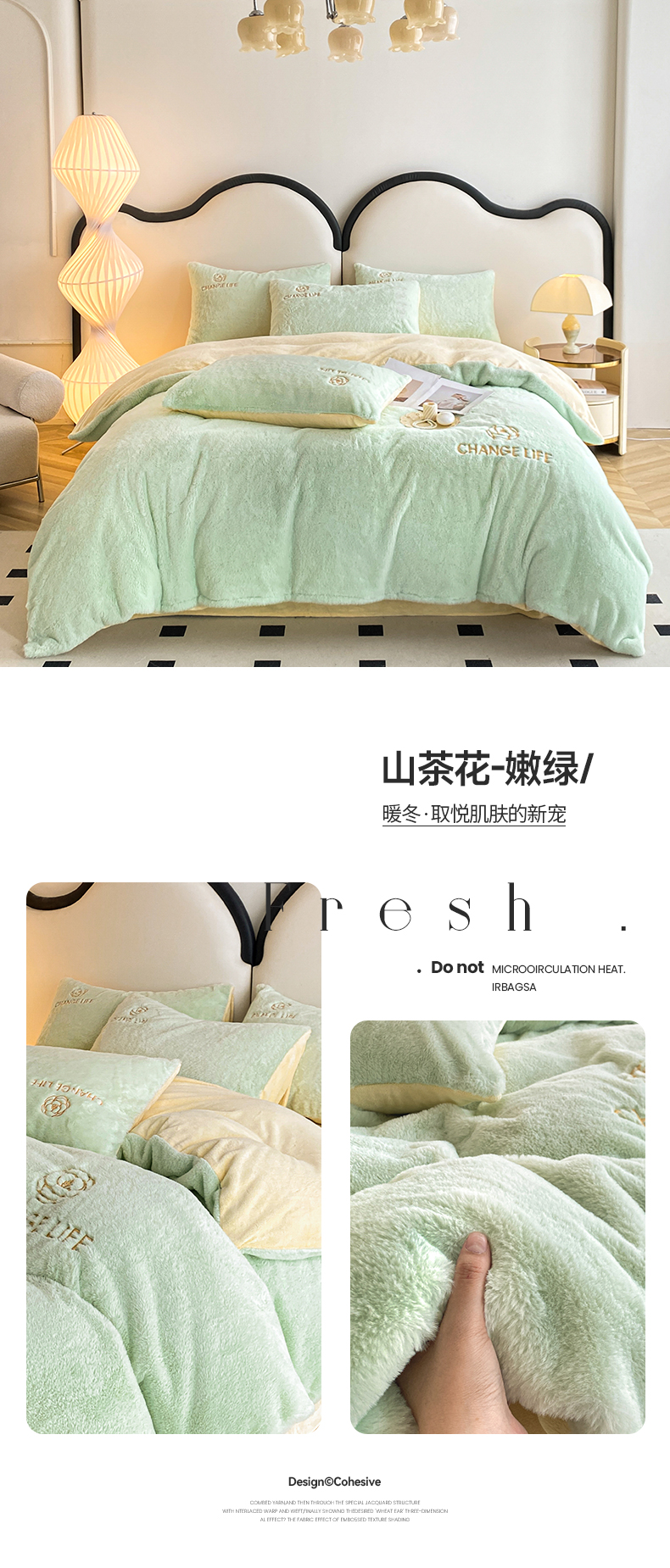商品名称:澳梵 2023新款【山茶花】小香风刺绣兔兔绒牛奶绒四件 山茶花-嫩绿