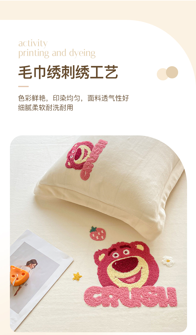 • 91家纺网 家纺一手货源 找家纺 丽美人家纺 2023新款迪斯尼牛奶绒毛巾绣床笠系列 草莓熊
