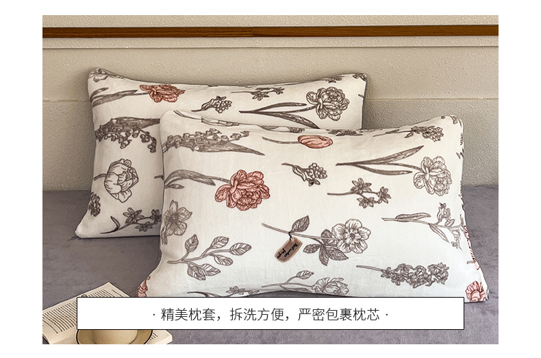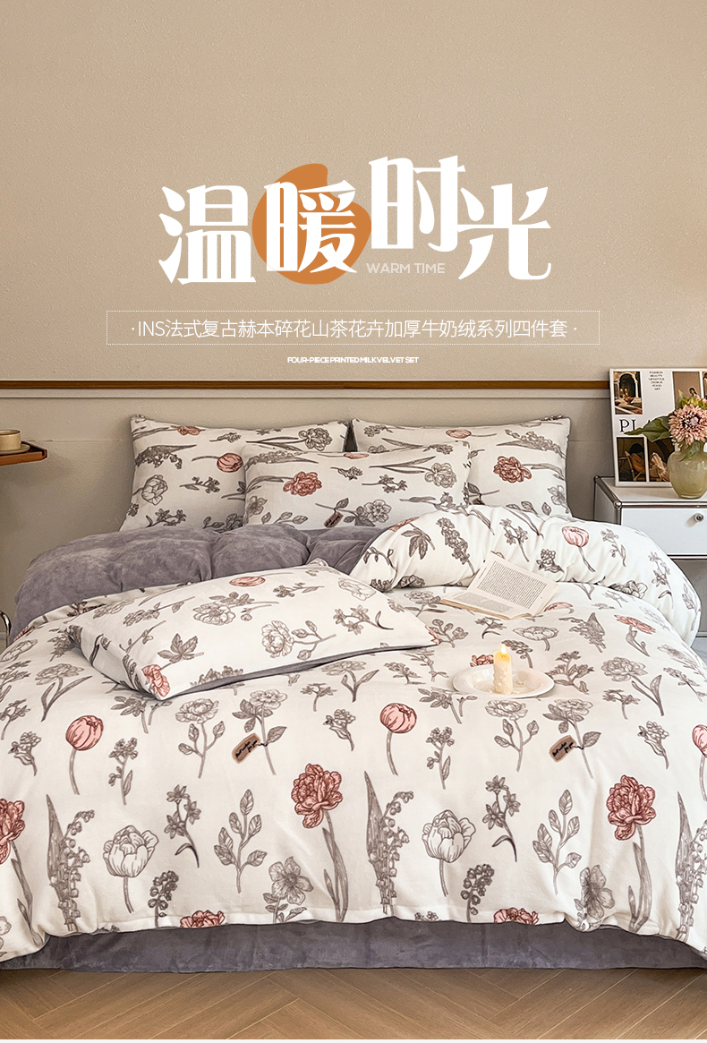 桃子家居 2023新款ins法式复古赫本碎花山茶花卉加厚牛奶绒系列四件套 绒-粉诺