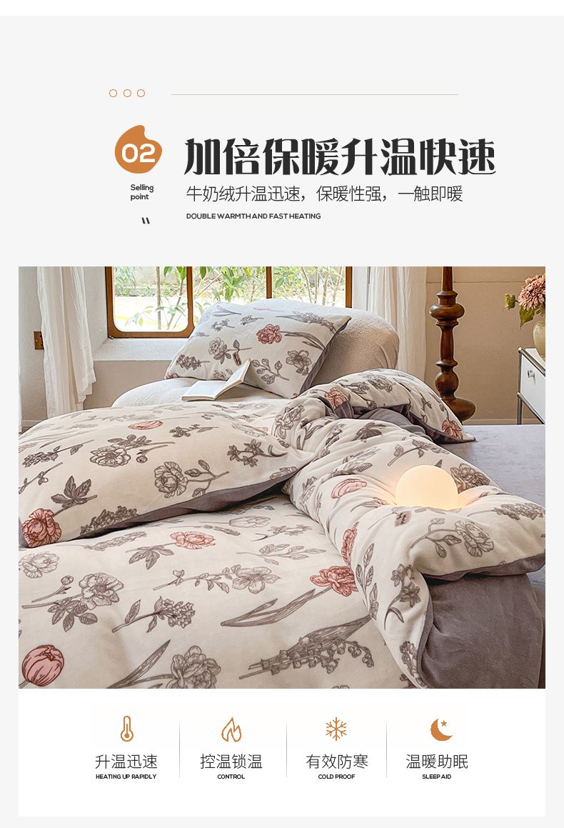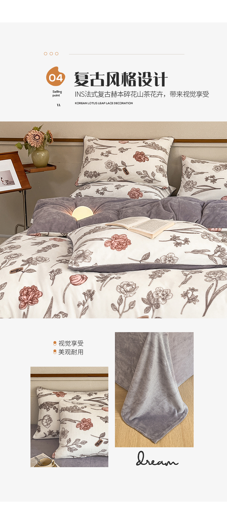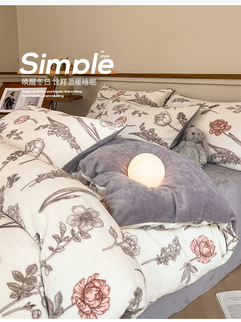 商品名称:桃子家居 2023新款ins法式复古赫本碎花山茶花卉加厚牛奶绒系列四件套 绒-粉诺