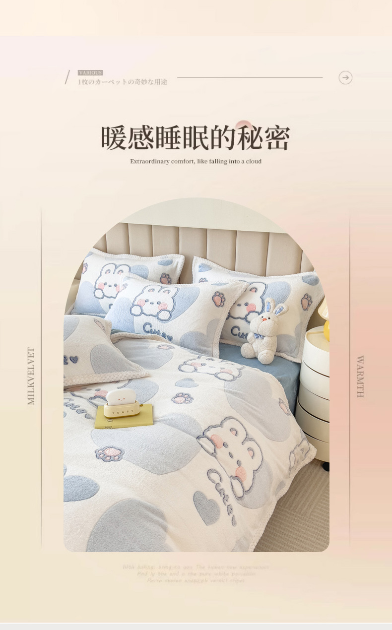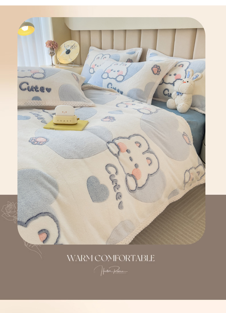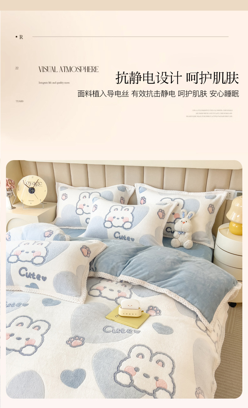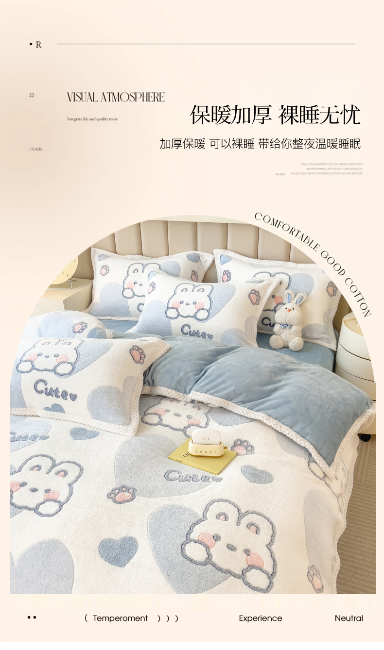 (总)倾慕家纺 2025新款卡通毛巾绣加厚保暖牛奶绒四件套,爱心女孩,咖啡小狗,猫咪熊兔,迷你小车,圣诞树熊,音乐企鹅