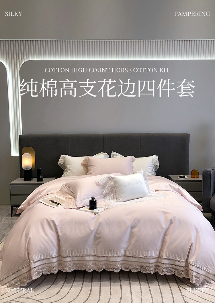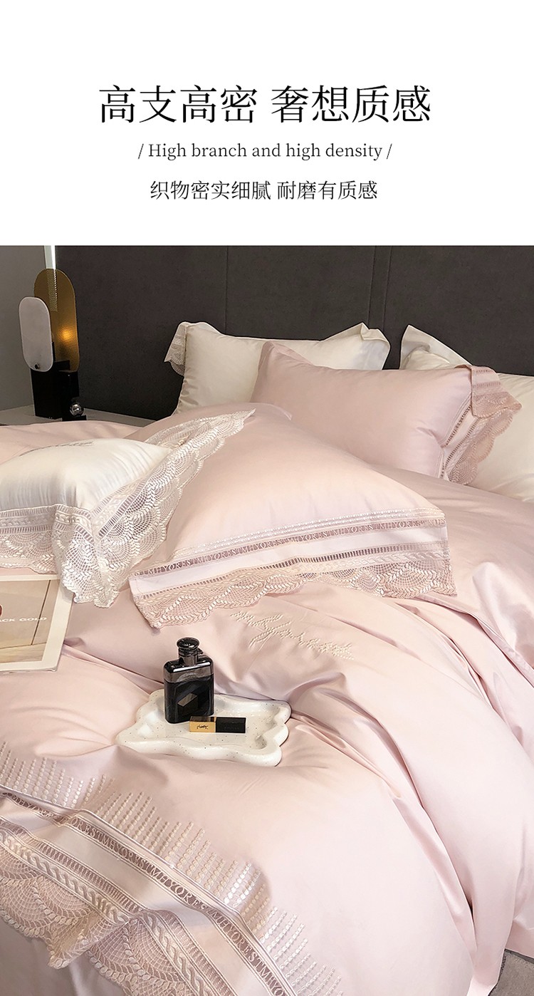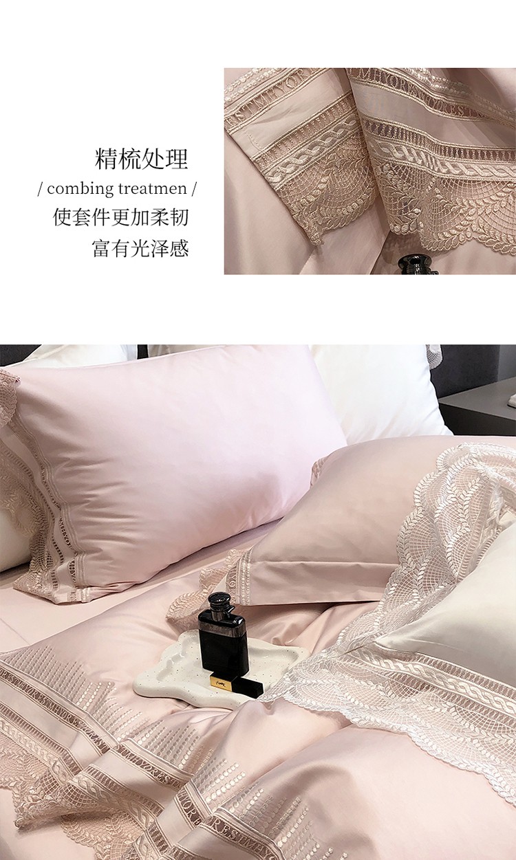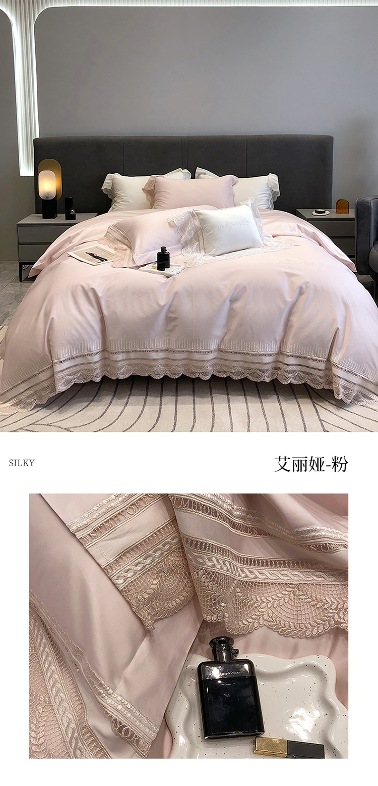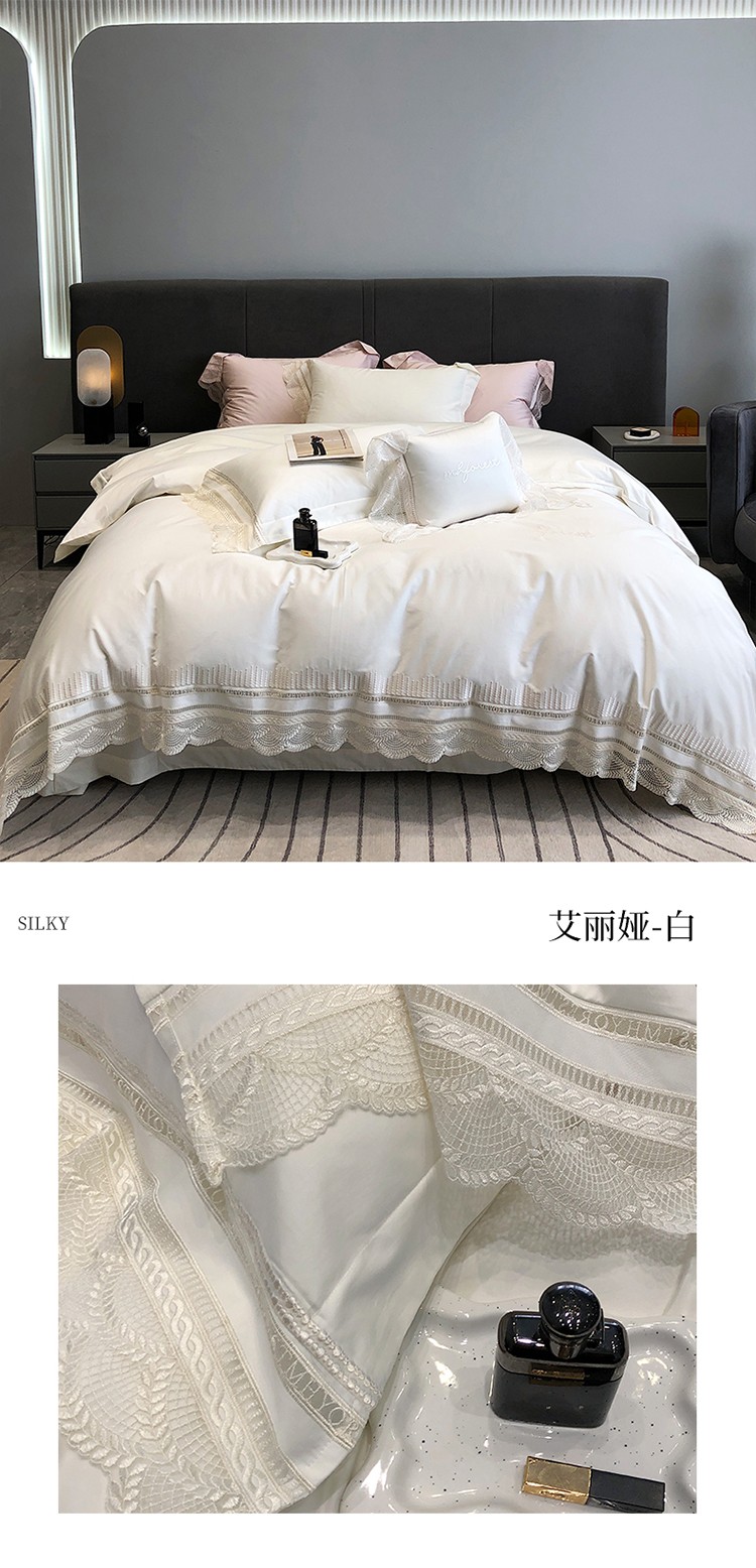 (总)黑白森林2024款 80X80S高支天丝棉四件套镂空蕾丝花边天丝全棉,尚美-晨夕粉,尚美-古象白,尚美-青砂绿,尚美-银雪灰
