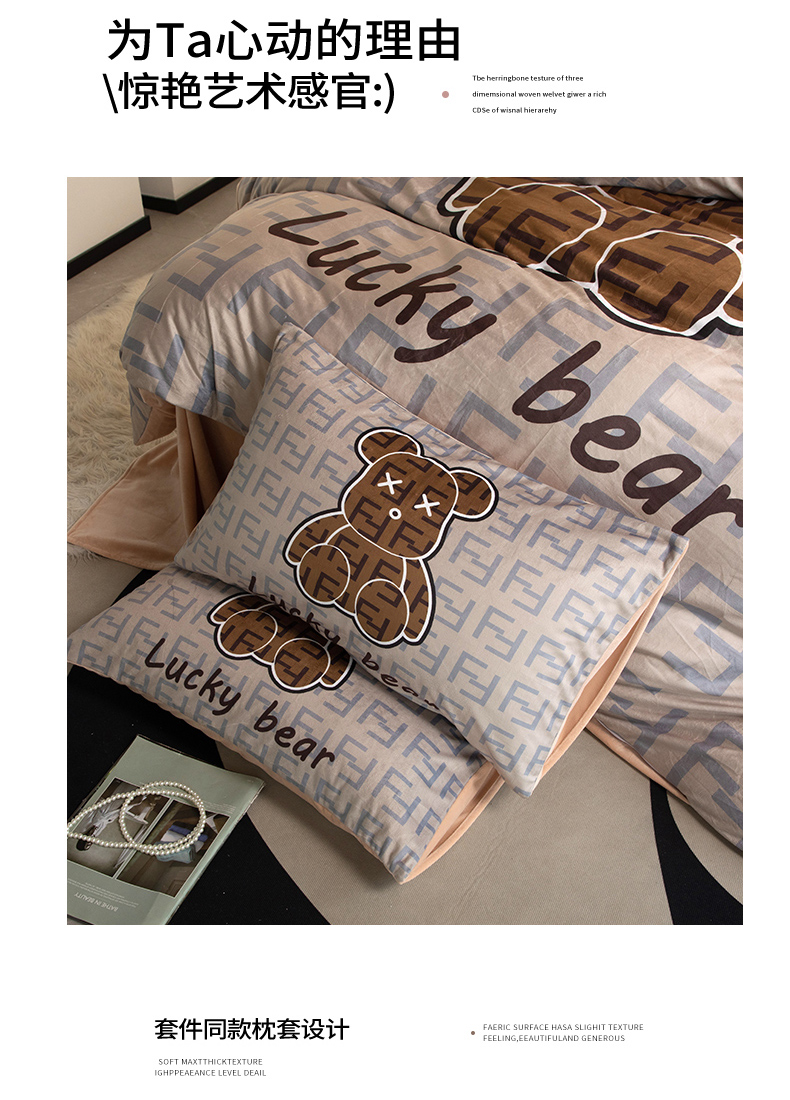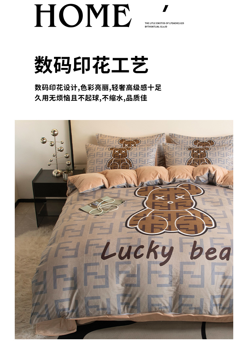 (总)摩卡(乐趣) 2025新款牛奶绒大版数码印花四件套,白香花,芬利熊,黑白V,灰迪,咔芬,卡布熊,可可熊,蓝白格,罗兰粉,萌迪,七彩熊,棋盘格公仔,山茶花,熊头白,熊仔白,熊仔咖