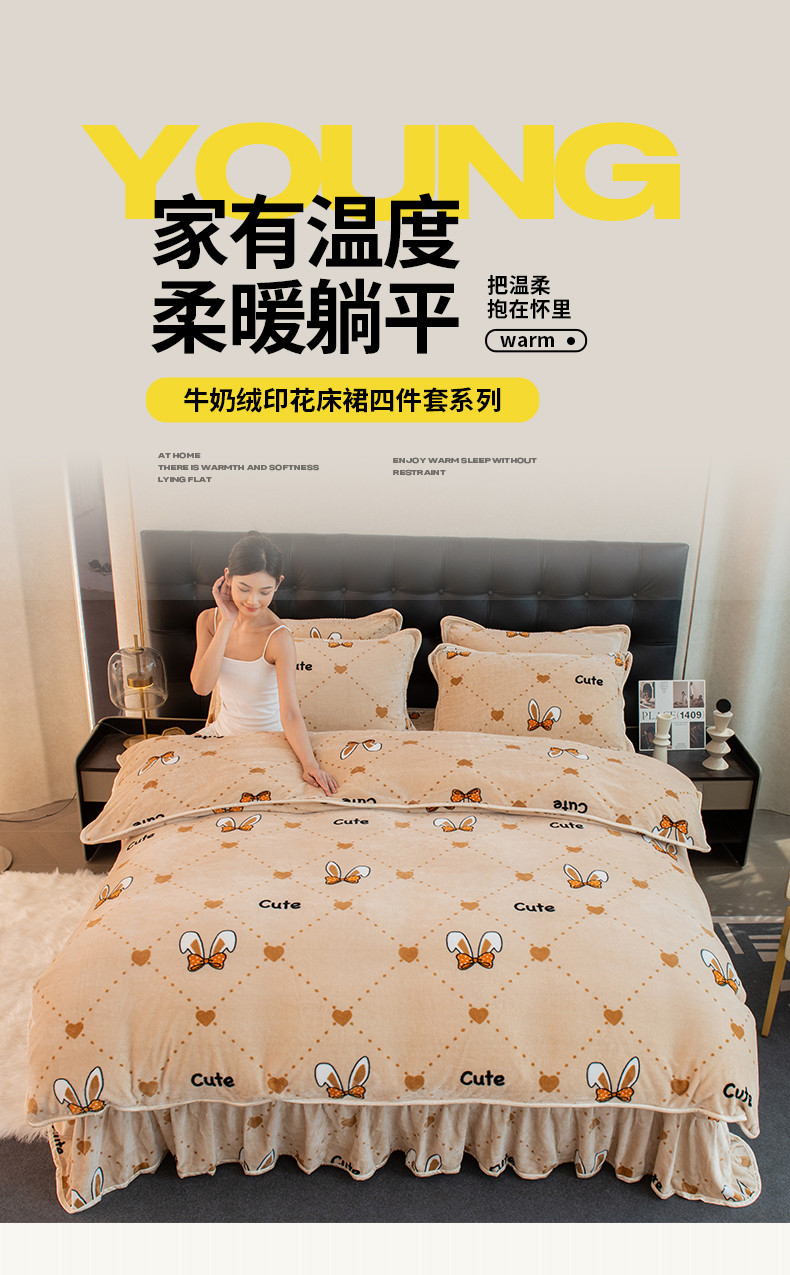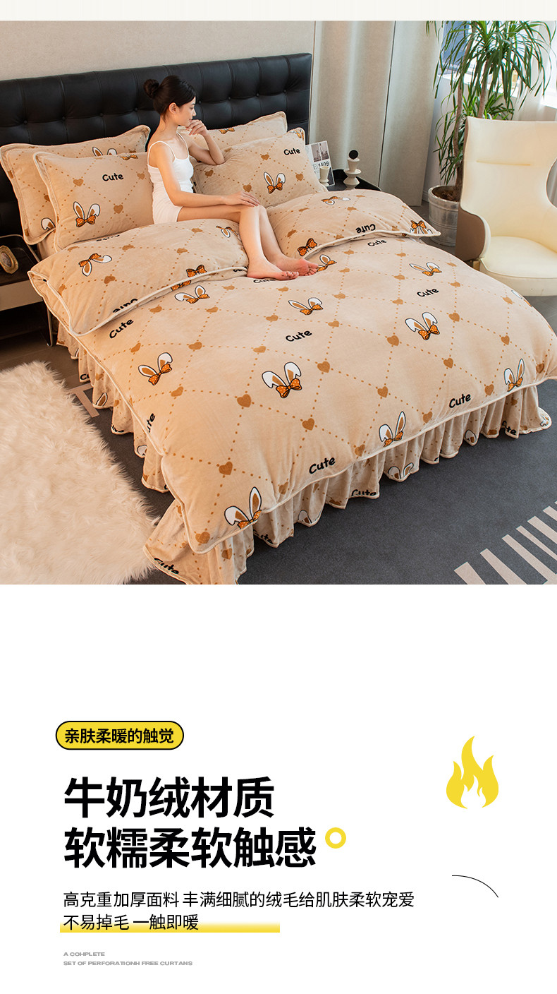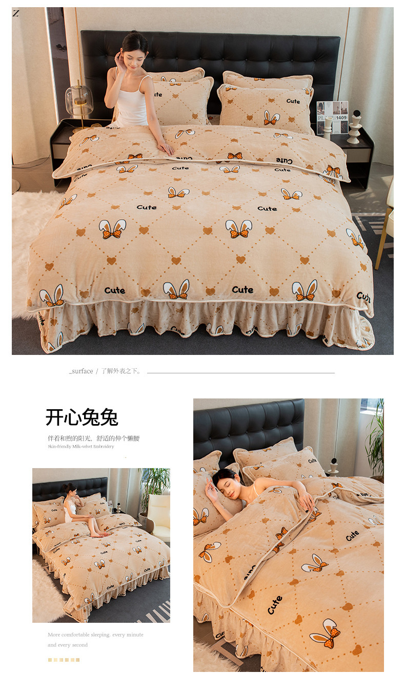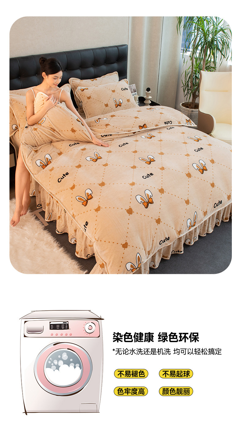 2024印花8.5斤牛奶绒金貂水晶法莱珊瑚绒四件套床裙款 可爱兔兔