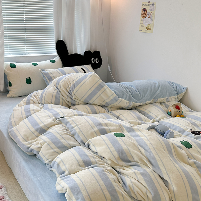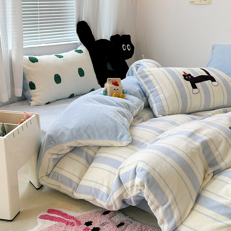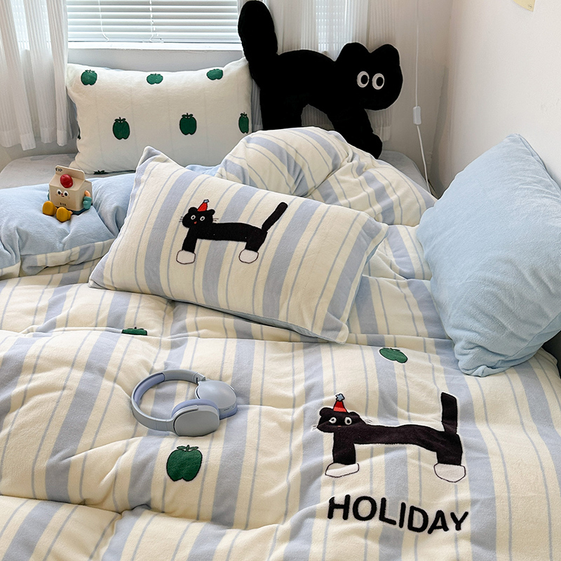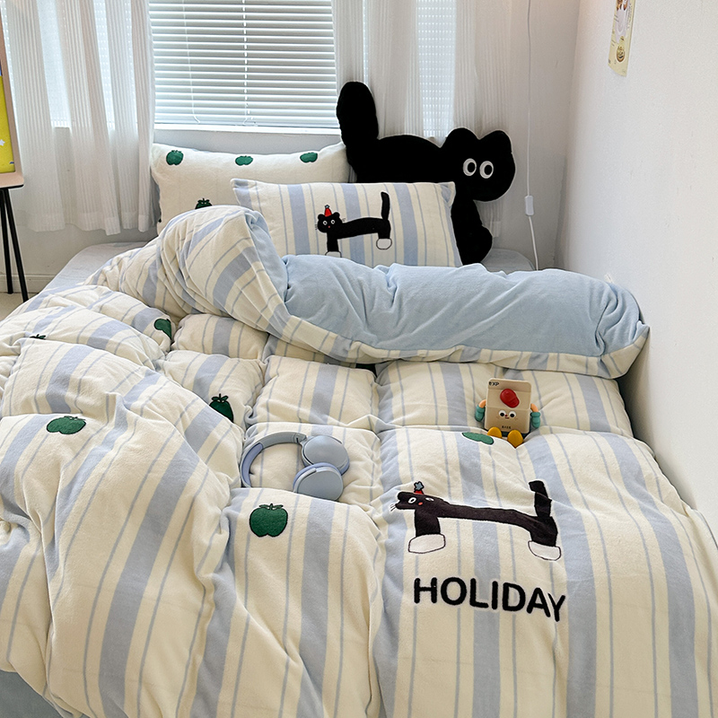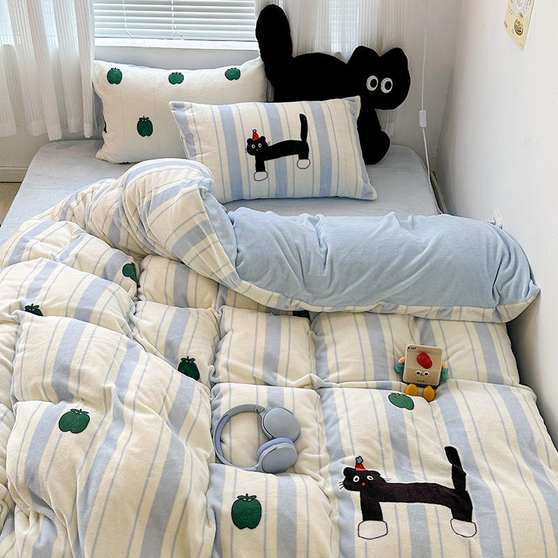 昔可家纺 2023新款大版数码印花保暖牛奶绒四件套 绿苹果小黑猫