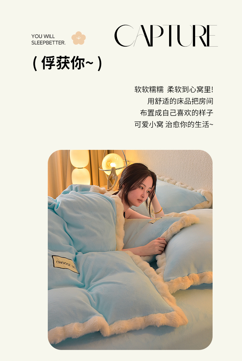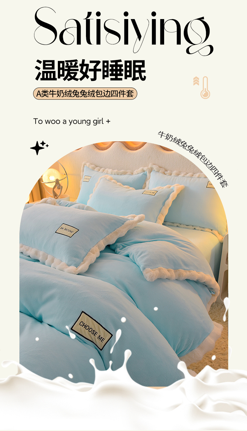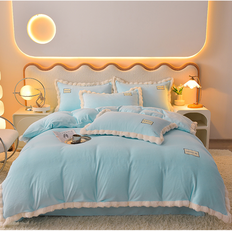 米奈家居 2025新款A类高克重牛奶绒四件套-卡洛琳 天空蓝