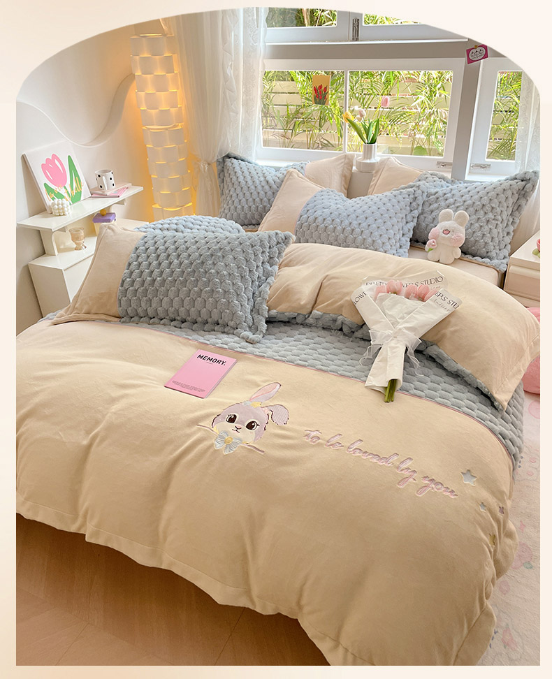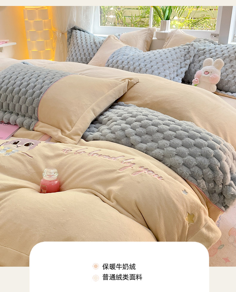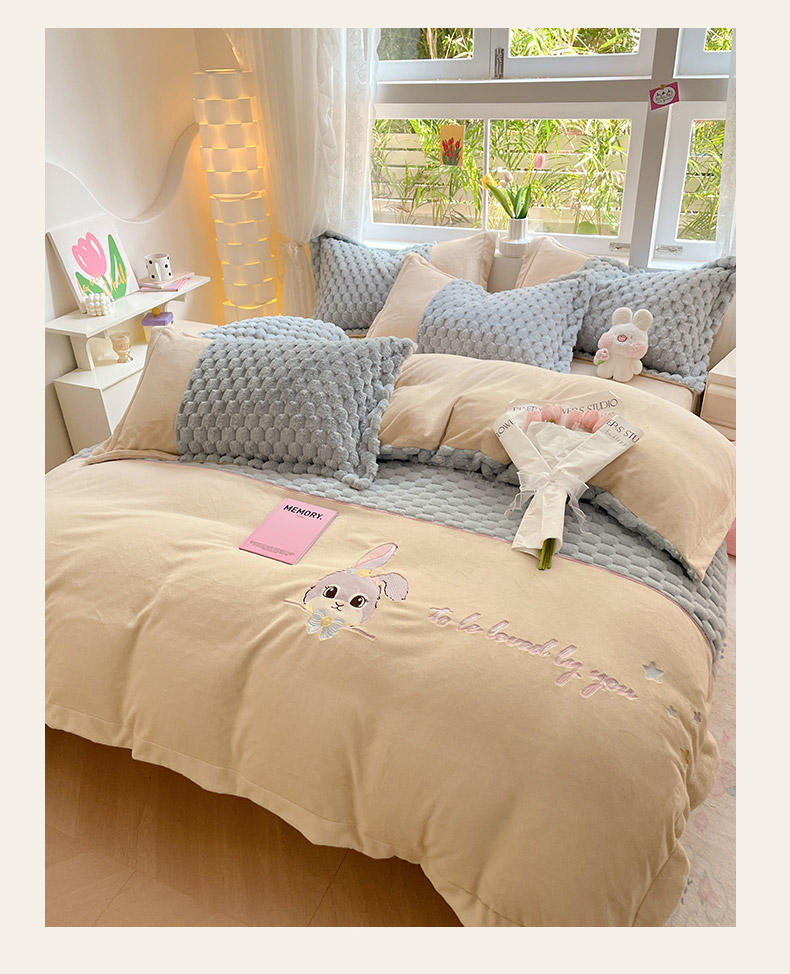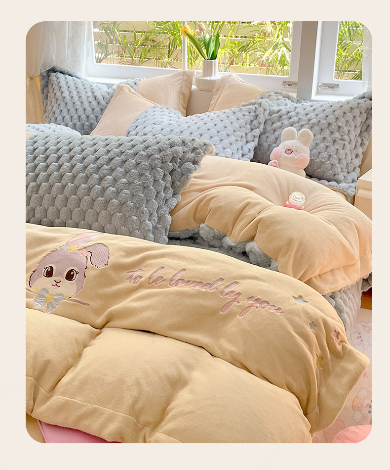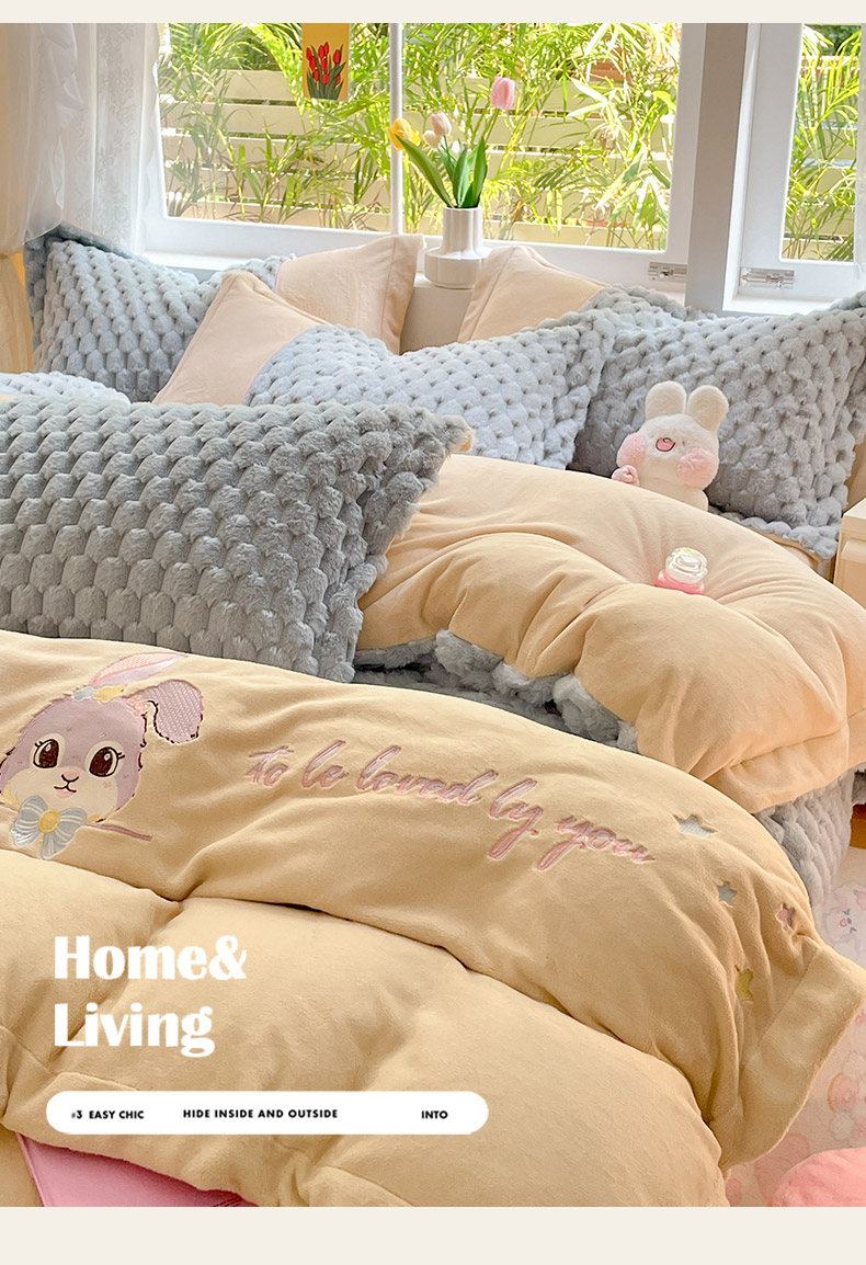 (总)爱上家居 2024新款AB版兔兔绒牛奶绒四件套,粉色,灰色,绿色,驼色,紫色