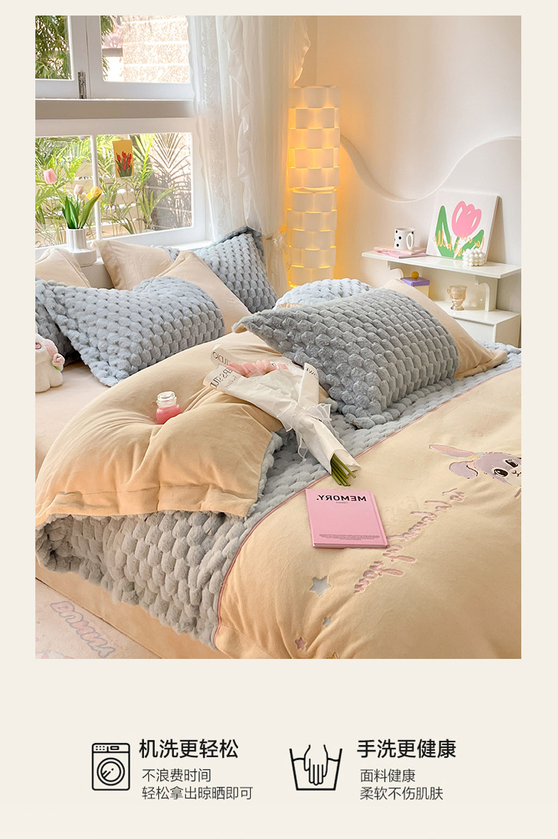 (总)爱上家居 2024新款亲肤舒适纯色兔兔绒牛奶绒四件套,白色,粉色,灰色,米白,苹果绿,浅蓝,深绿,驼色,紫色