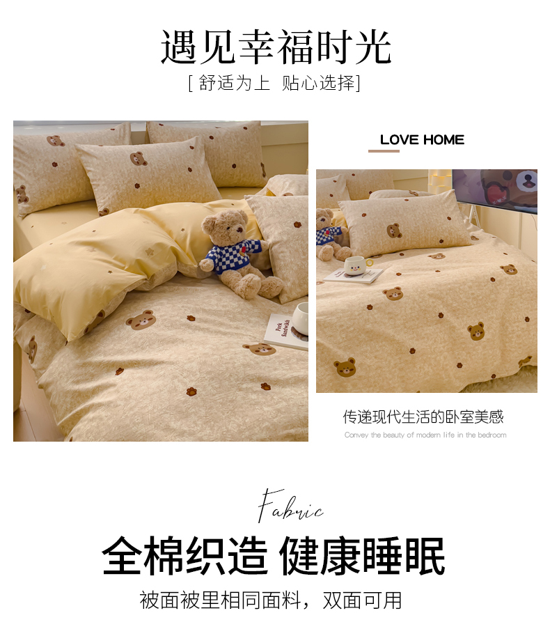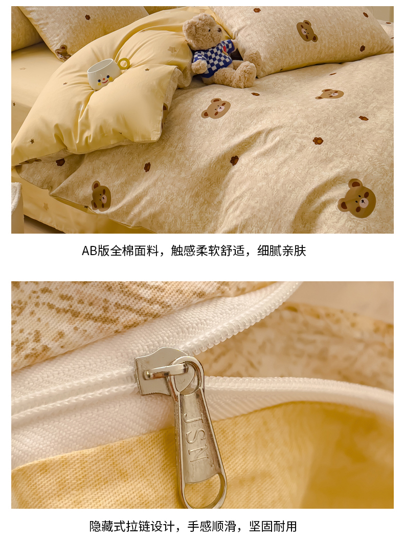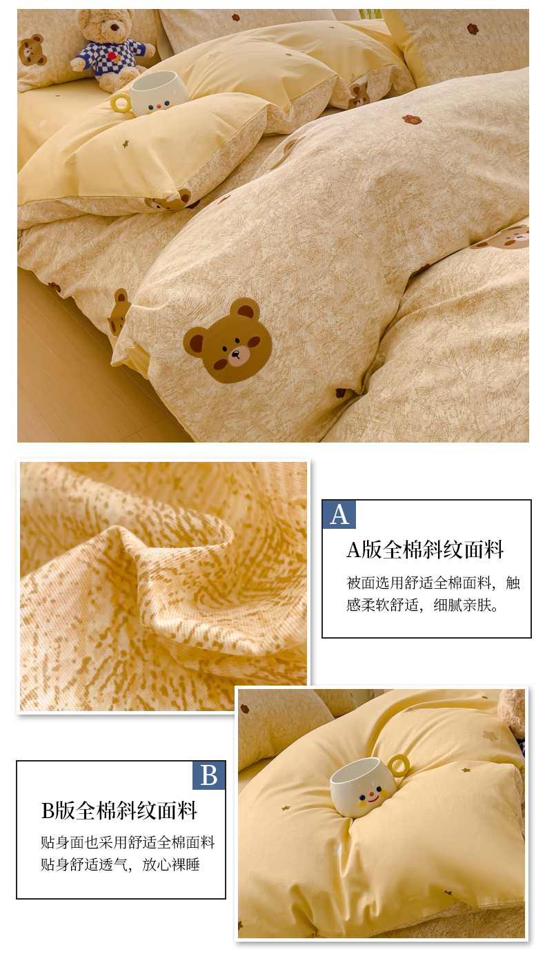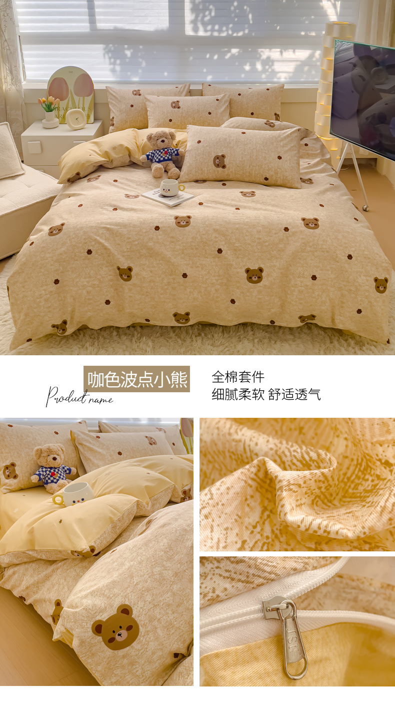 当前位置: 91家纺网 > 商品网购 > 床品套件 > 四件套 > 全棉普通四件套 > 金丝鸟 2024新款全棉四件套可爱卡通系列四件套 咖色波点小熊