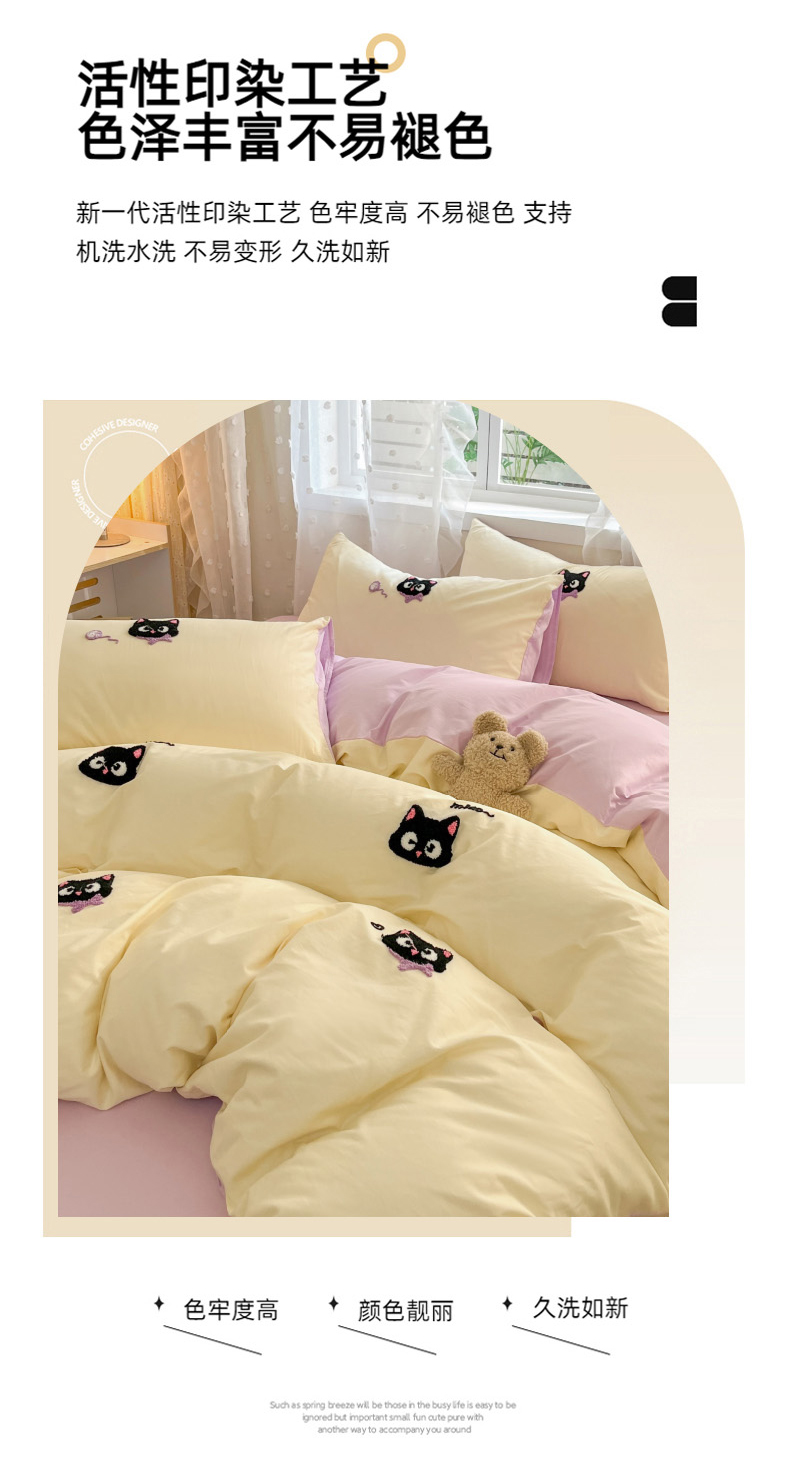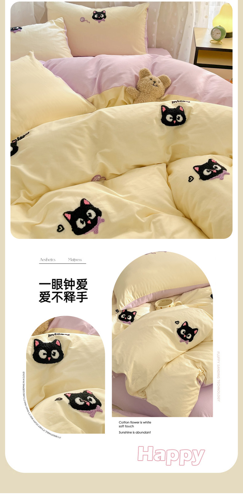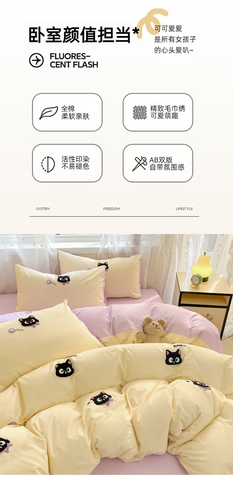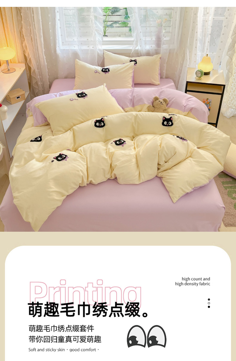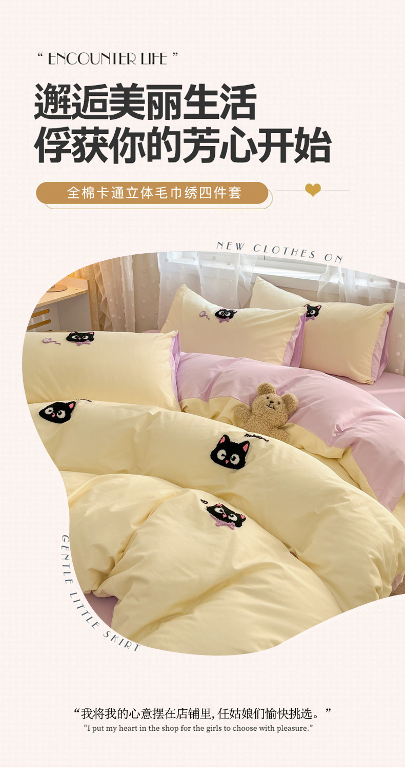 商品名称:丽涵家纺 2025新品全棉纯色毛巾绣可爱卡通四件套 散版-淘气猫