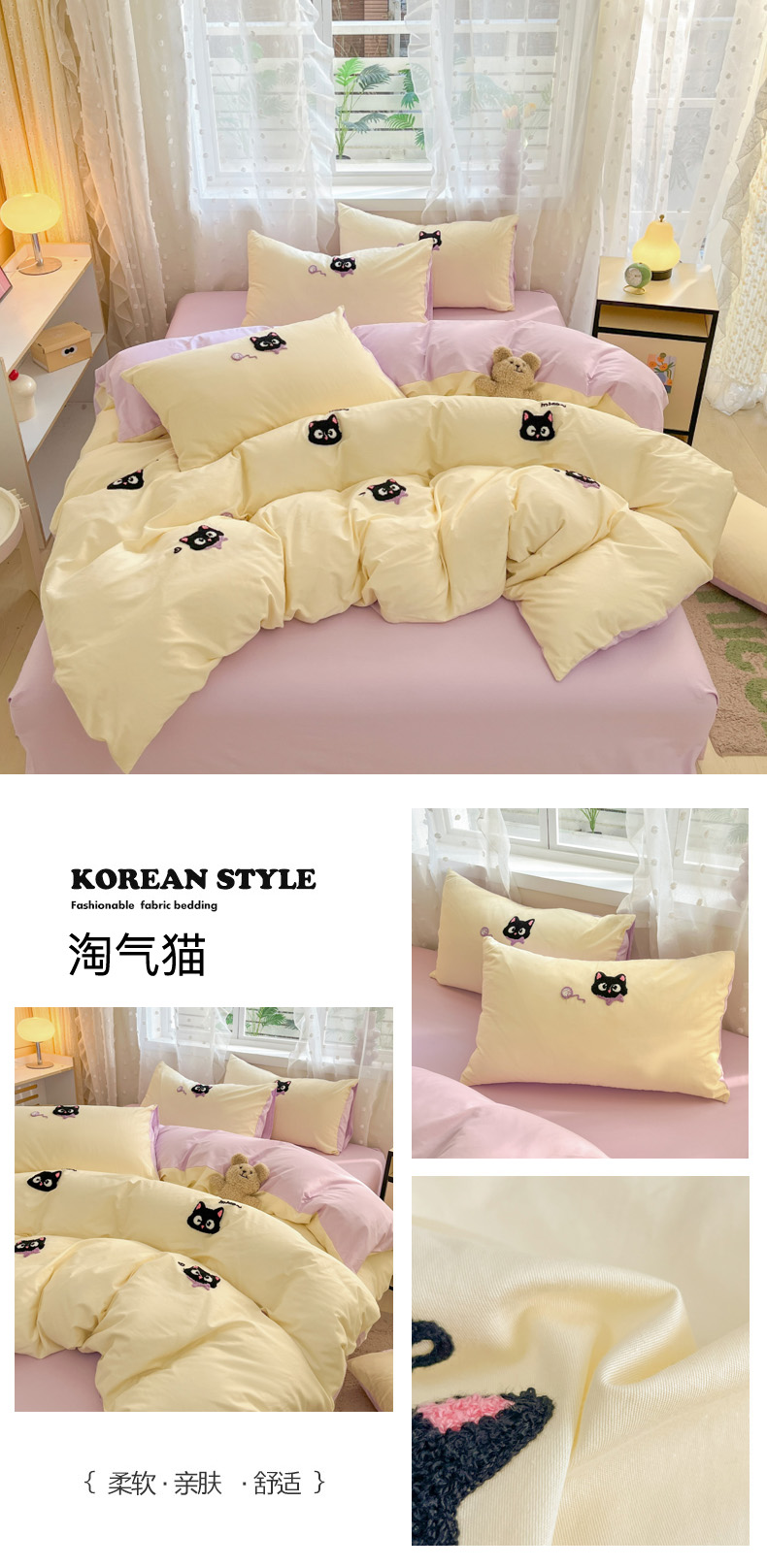 丽涵家纺 2025新品全棉纯色毛巾绣可爱卡通四件套 散版-淘气猫