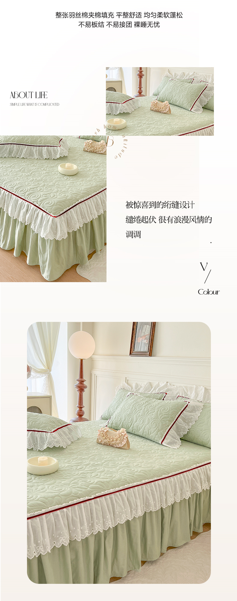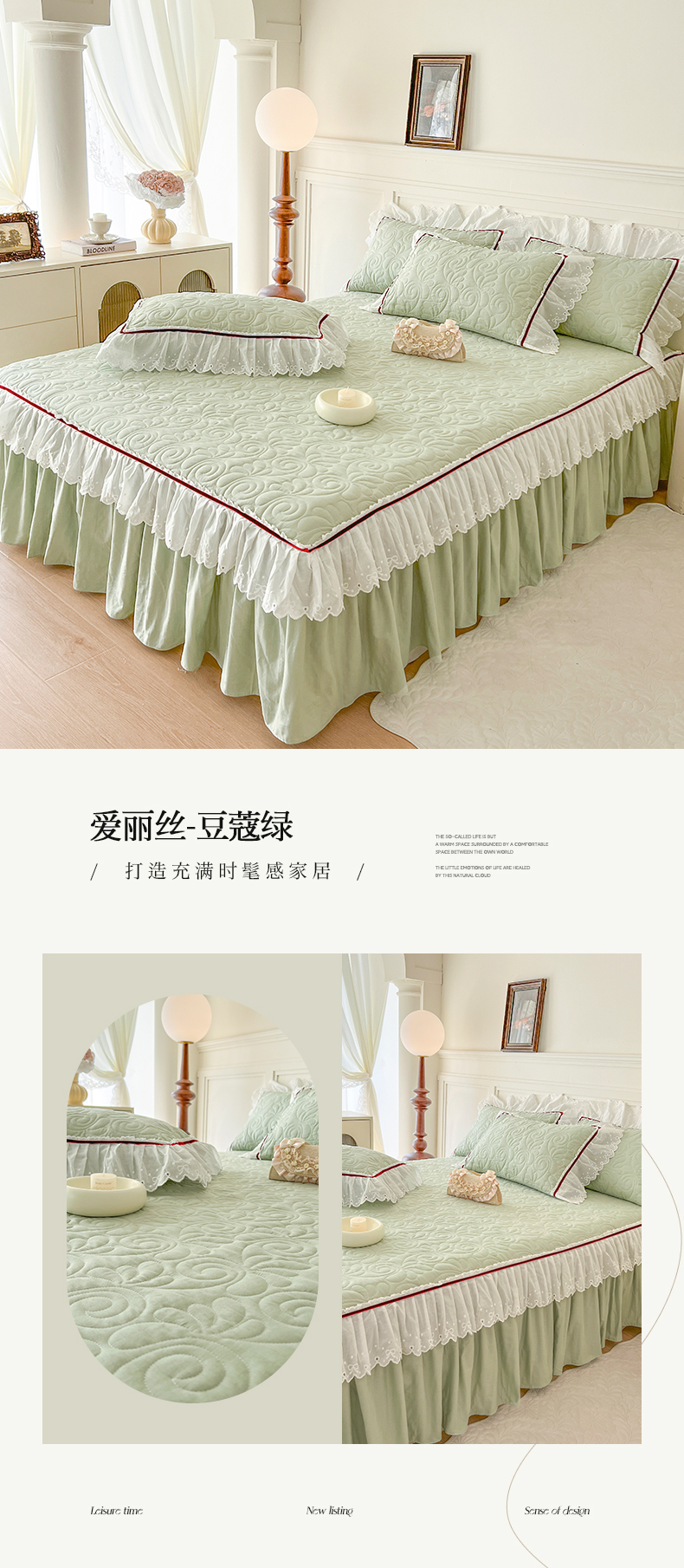 商品名称:网红馆 2025新款全棉双层纱花边款爱丽丝系列单床裙 豆蔻绿