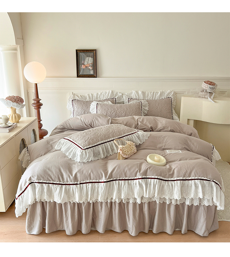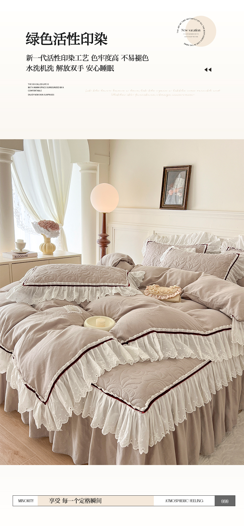 当前位置: 91家纺网 > 商品网购 > 床品套件 > 四件套 > 双层纱四件套 > 网红馆 2025新款全棉双层纱四件套花边款爱丽丝系列 杏子灰