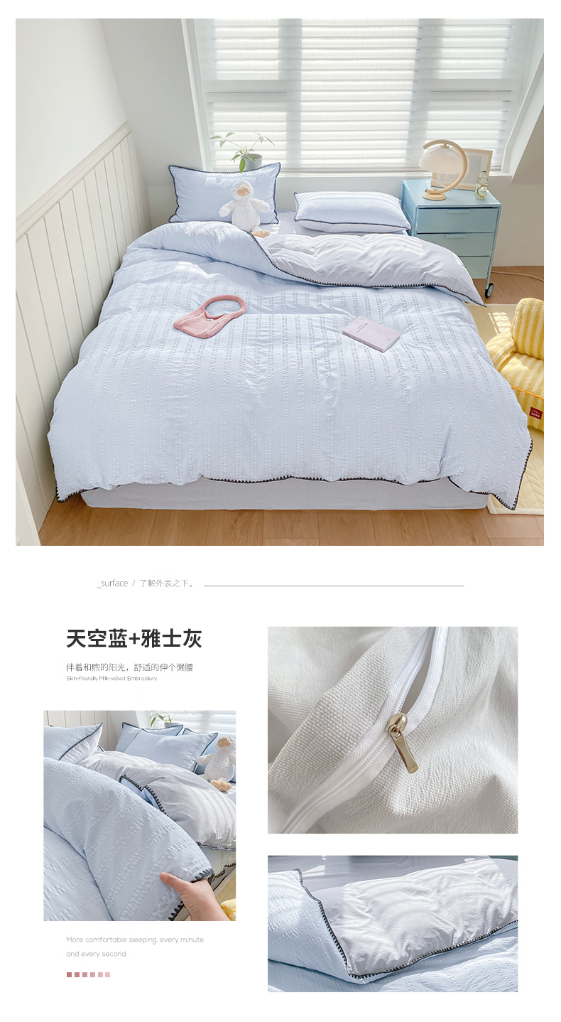 商品名称:羋多2024新款贝壳边雨泡泡棉泡泡纱双层纱四件套 天空蓝+雅士灰