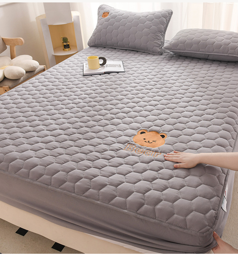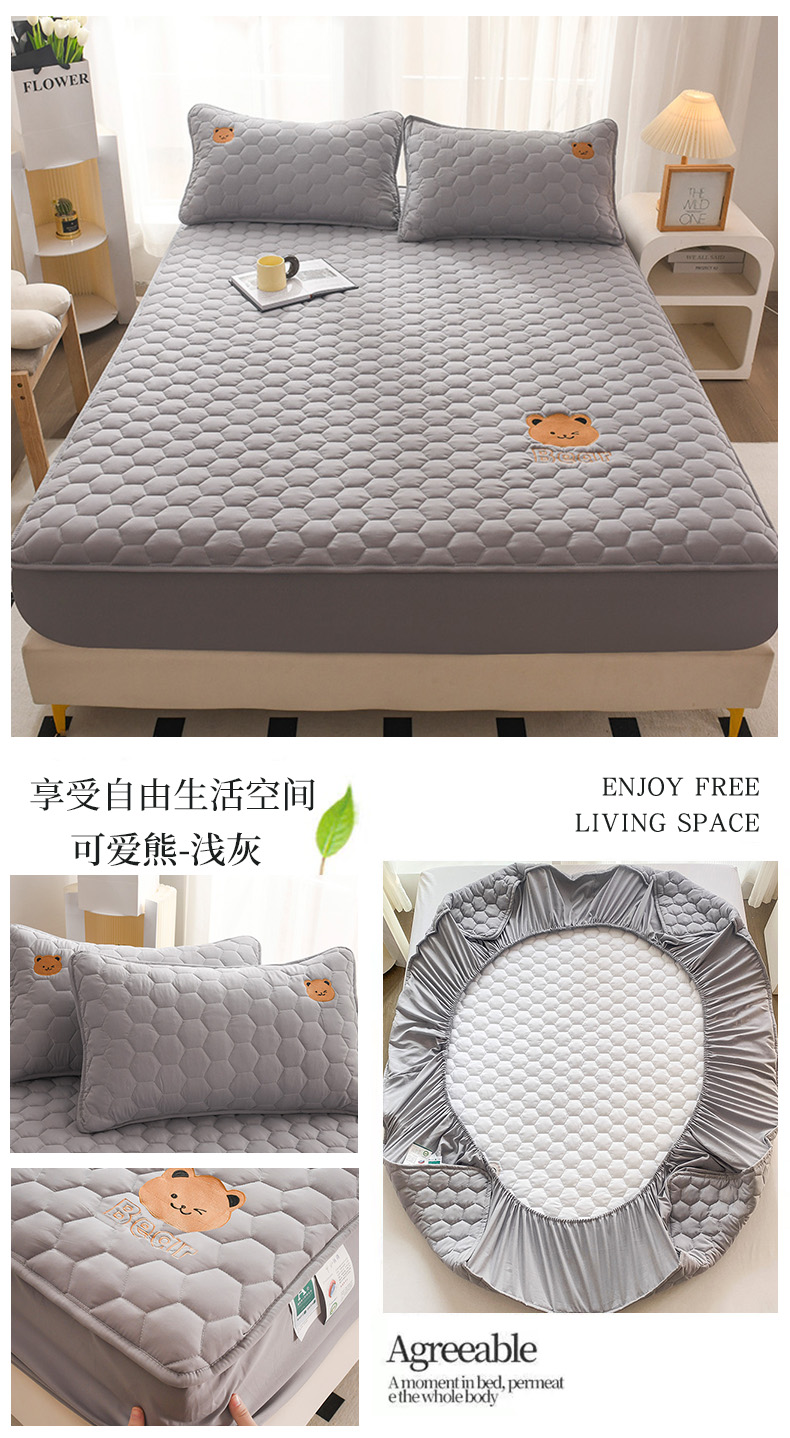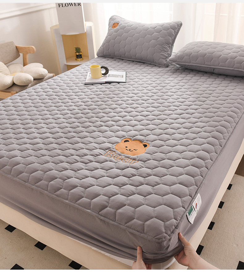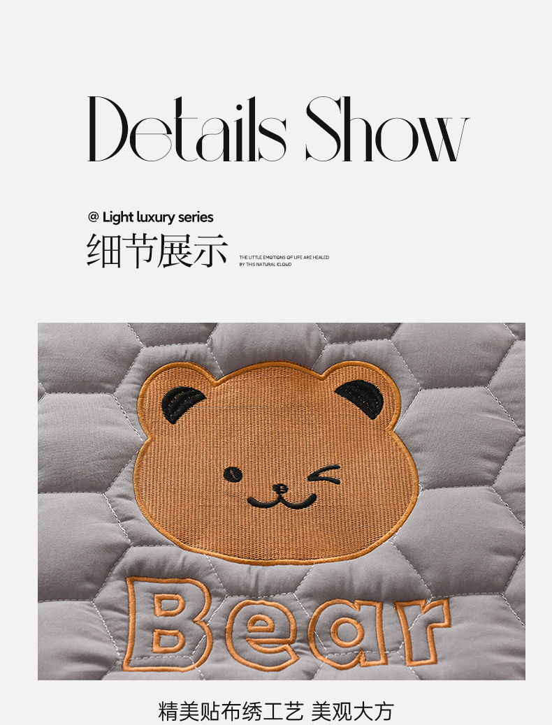 九亭家纺 2024新款A类水洗棉刺绣可爱熊夹棉床笠 可爱熊-浅灰