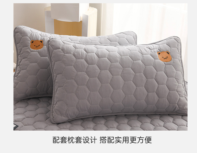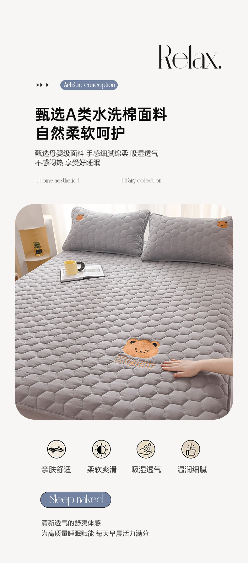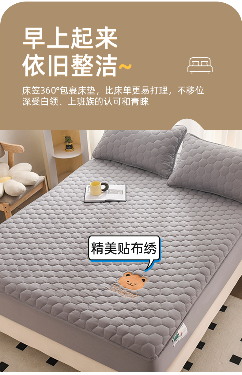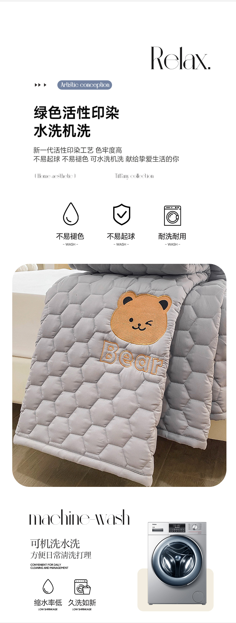 九亭家纺 2024新款A类水洗棉刺绣可爱熊夹棉床笠 可爱熊-浅灰