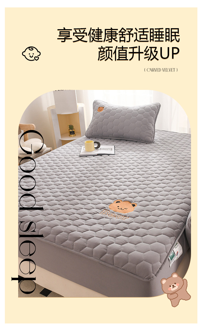 • 91家纺网 家纺一手货源 找家纺 九亭家纺  2024新款A类水洗棉刺绣可爱熊夹棉床笠 可爱熊-浅灰