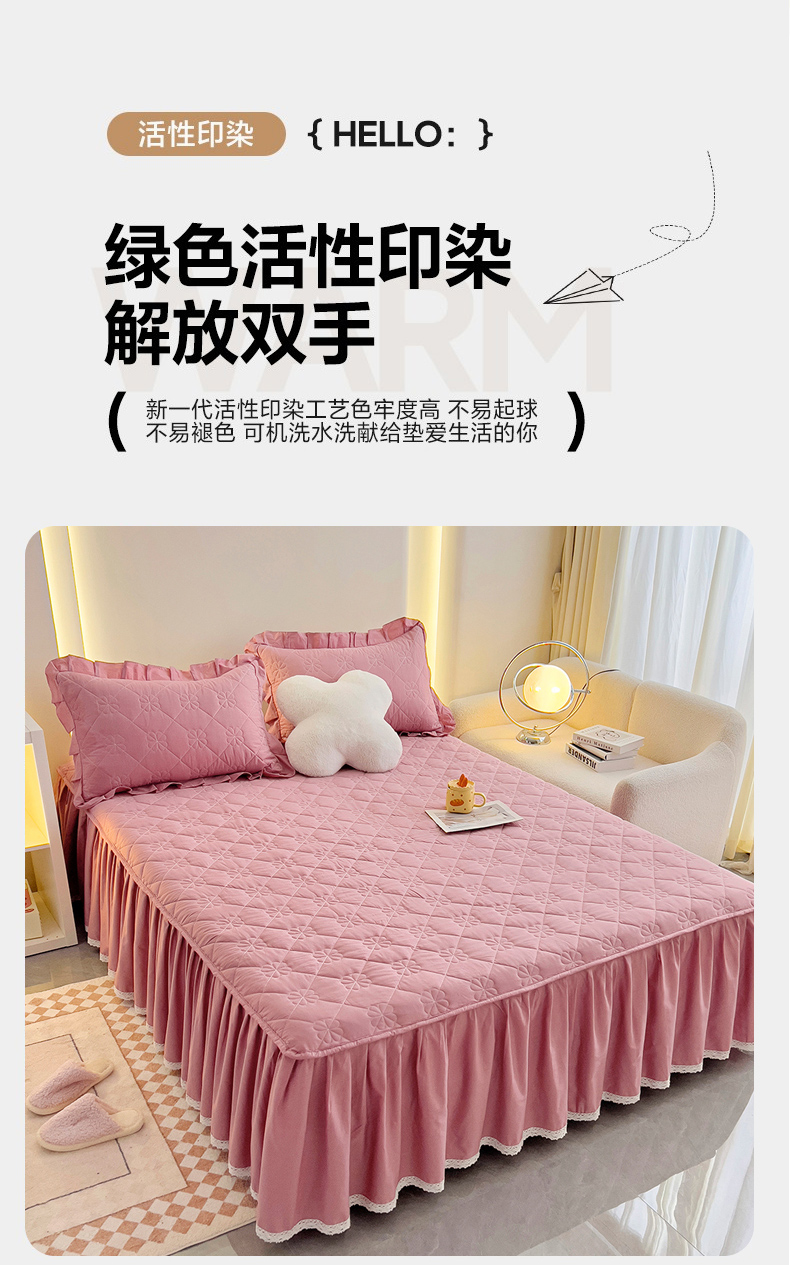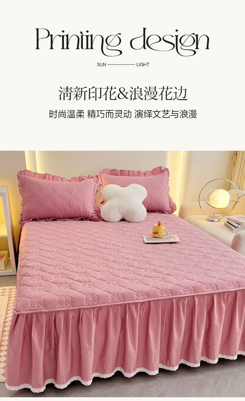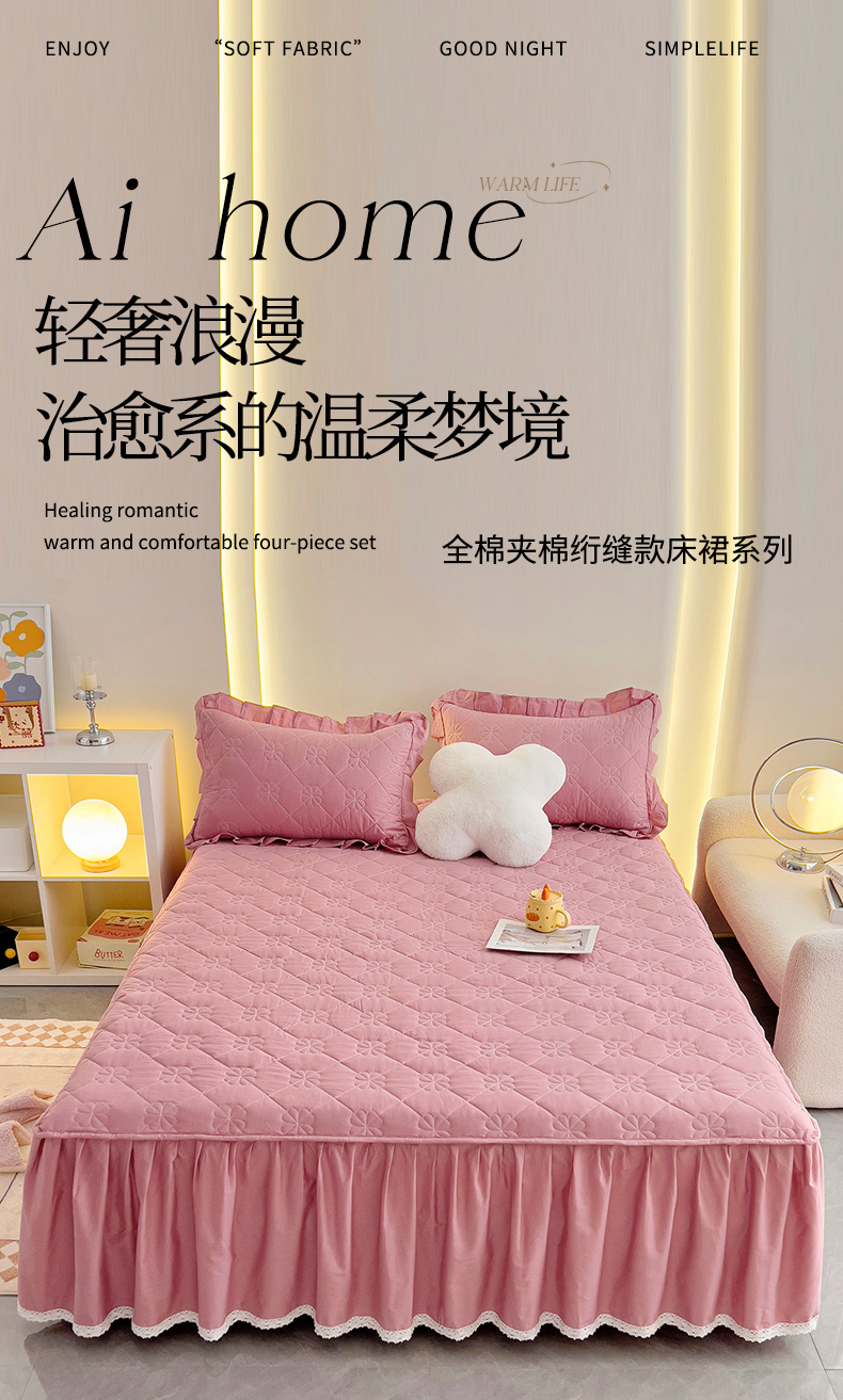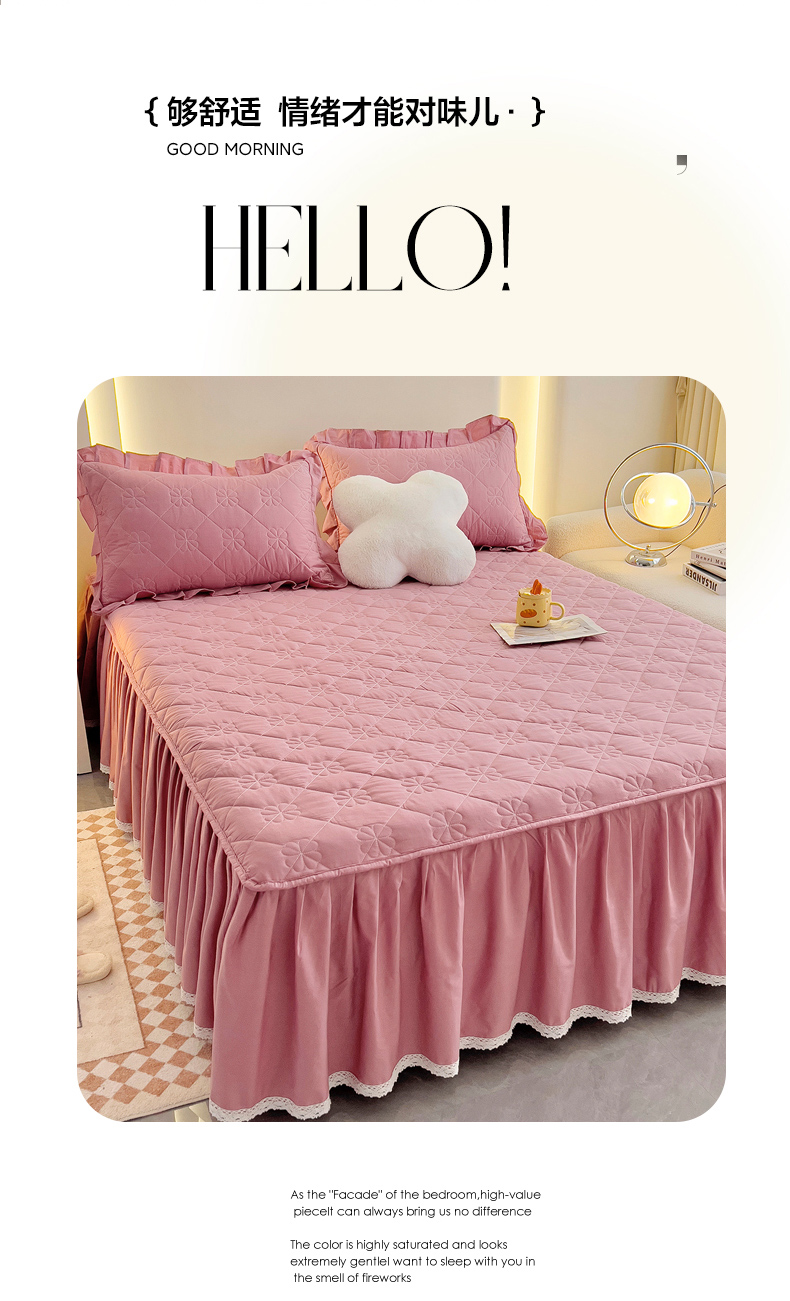 当前位置: 91家纺网 > 商品网购 > 床上用品 > 凉席 > 乳胶凉席 > 情煊家纺 2024新款全棉亲肤夹棉纯色印花床裙单品系列-单床裙 豆沙