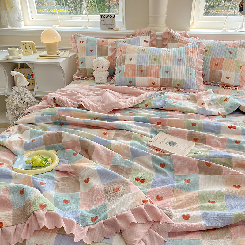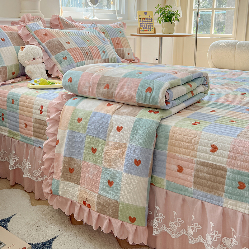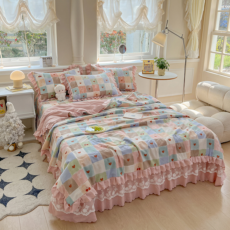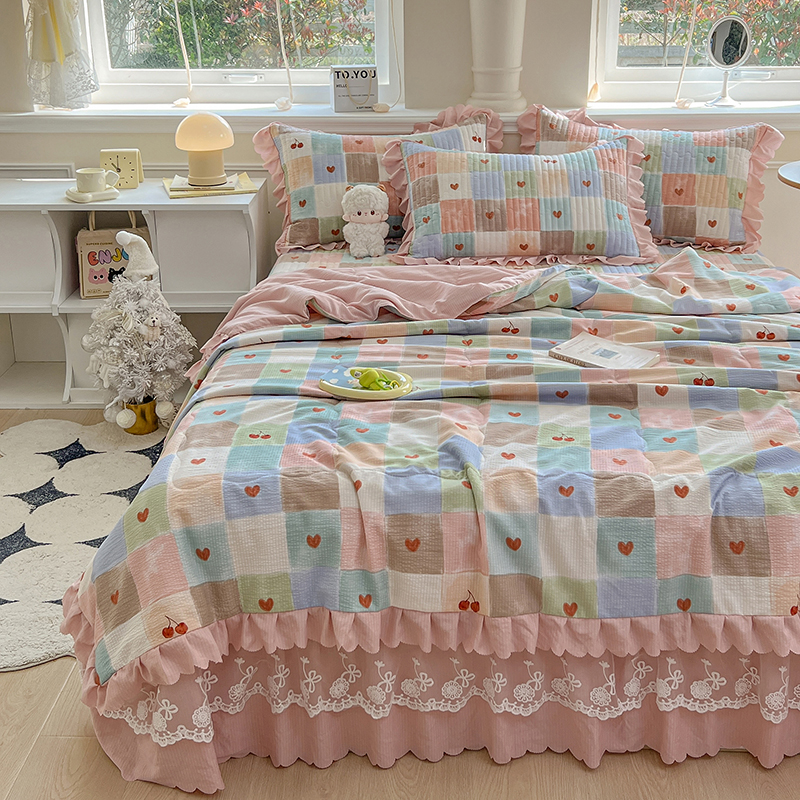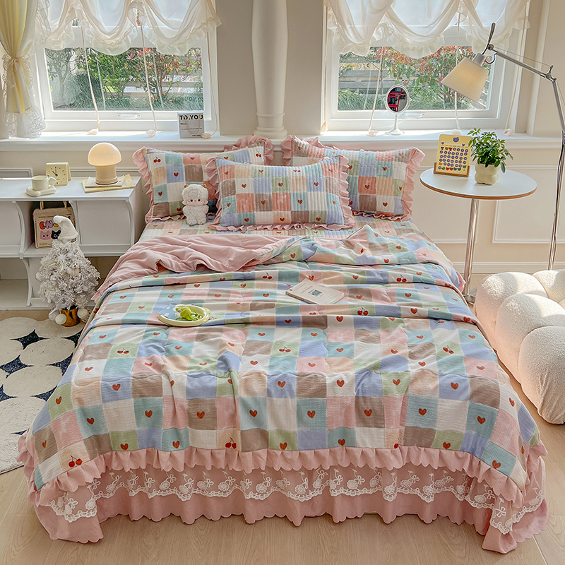当前位置: 91家纺网 > 商品网购 > 床品套件 > 四件套 > 夏被四件套 > 雅眠居 2024直播爆款泡泡棉床盖款夏被四件套双层蕾丝花边夹棉床裙款三件套 甜心樱桃