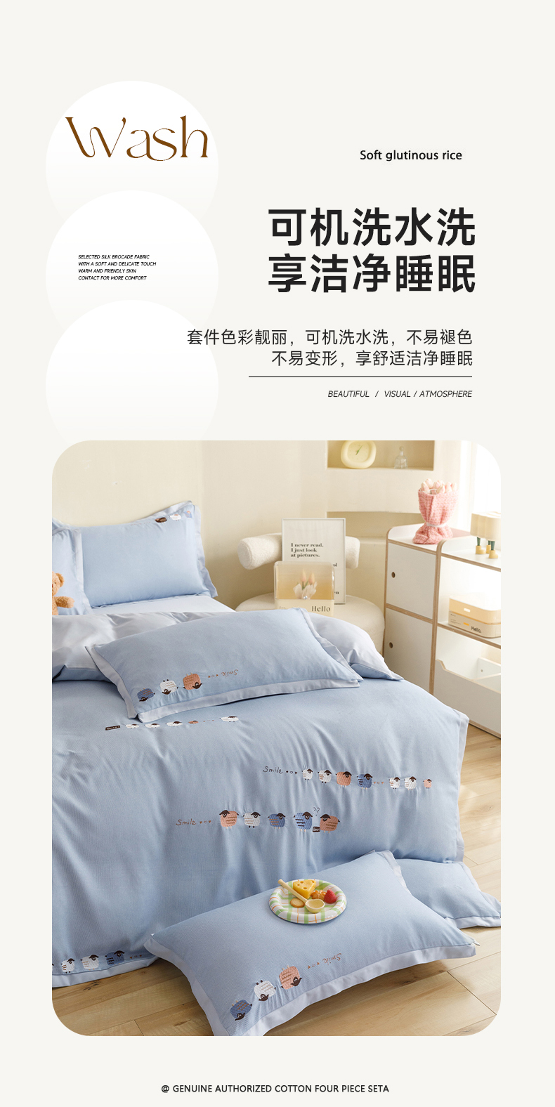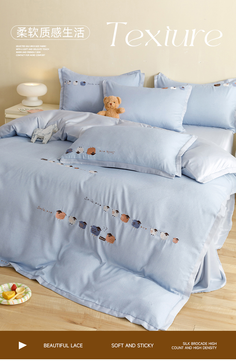 商品名称:狂想家 2025新款丝锦缎刺绣四件套 咩咩羊景蓝