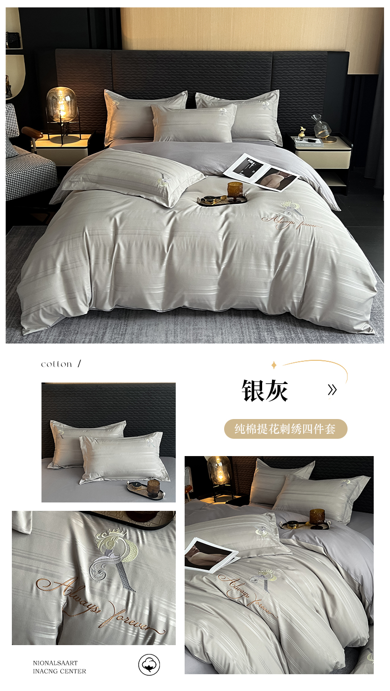 当前位置: 91家纺网 > 商品网购 > 床品套件 > 四件套 > 全棉普通四件套 > 韩秀家纺 2024新款纯棉刺绣提花四件套-遇见 遇见-银灰