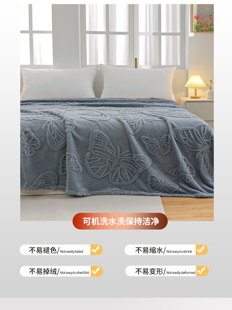 (总)金来家纺 2024新款单层双面塔芙绒蝴蝶花提花毛毯,蝴蝶粉色,蝴蝶咖啡,蝴蝶绿色,蝴蝶米白,蝴蝶浅灰,蝴蝶浅咖,蝴蝶深灰,蝴蝶雾蓝,蝴蝶紫色