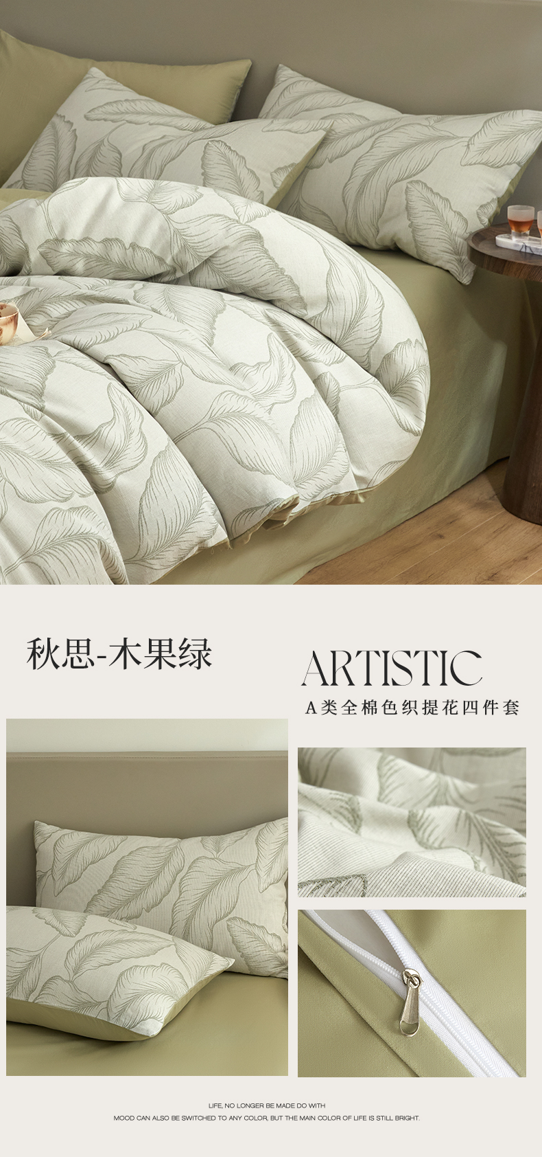 当前位置: 91家纺网 > 商品网购 > 床品套件 > 四件套 > 全棉普通四件套 > 慕色家纺 2024新款A类全棉色织提花四件套系列 秋思-木果绿