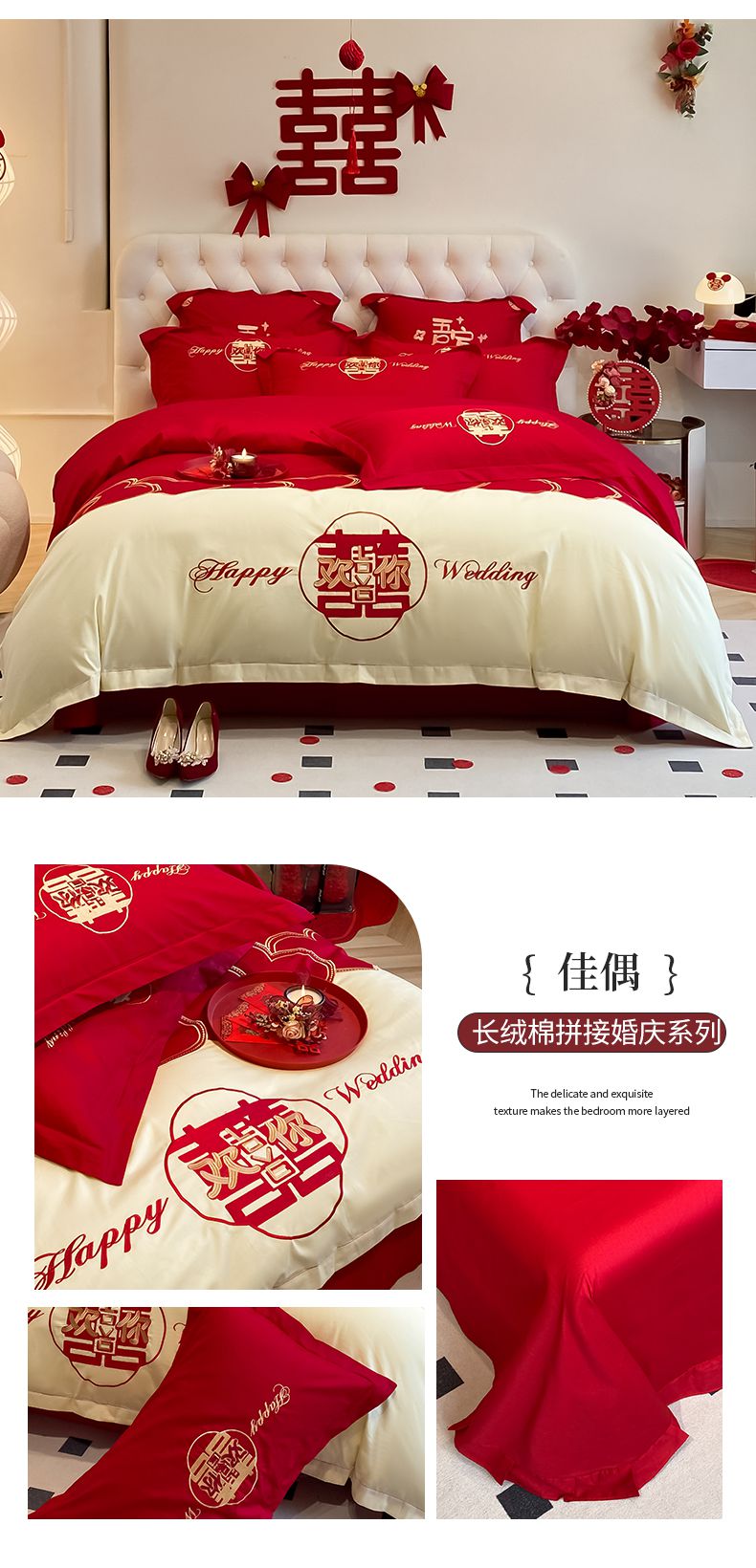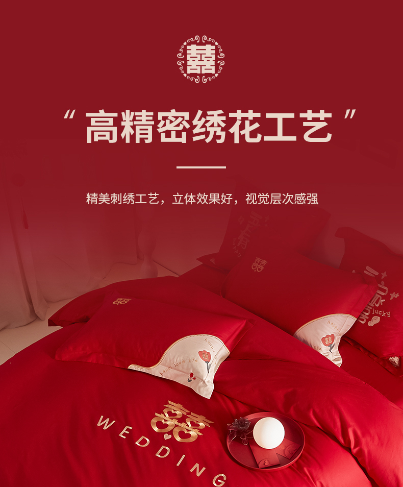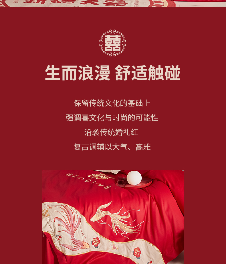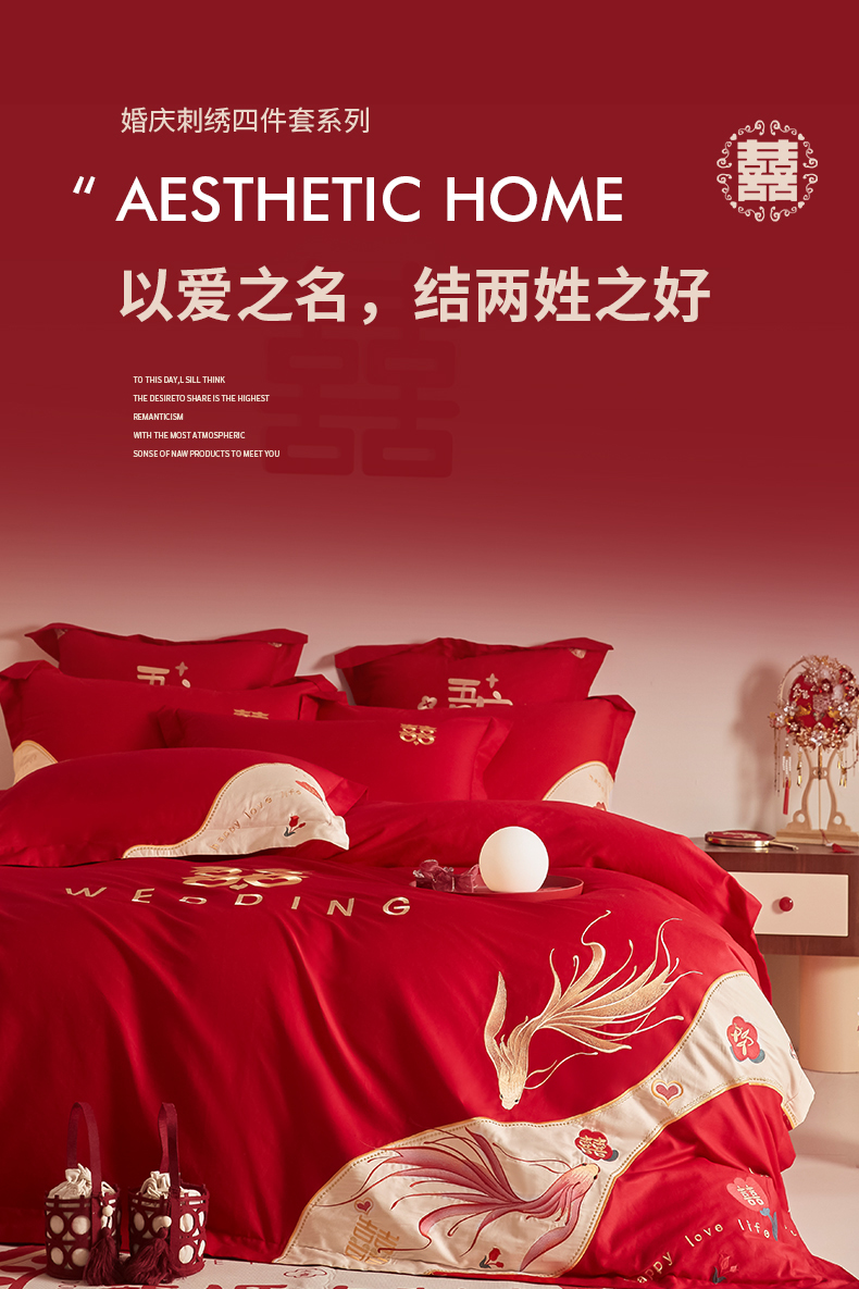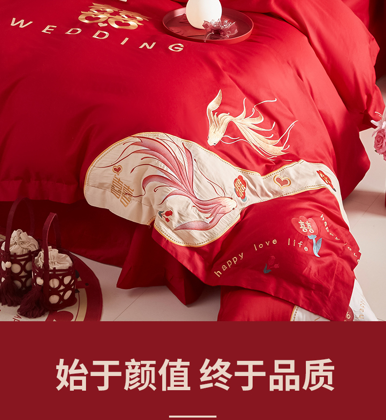 当前位置: 91家纺网 > 商品网购 > 床品套件 > 四件套 > 婚庆四件套 > 玉雅家纺 2025新款60支长绒棉时尚拼色浮雕刺绣婚庆四件套 好运锦鲤