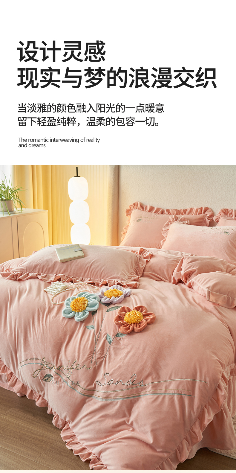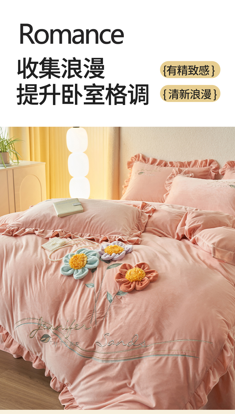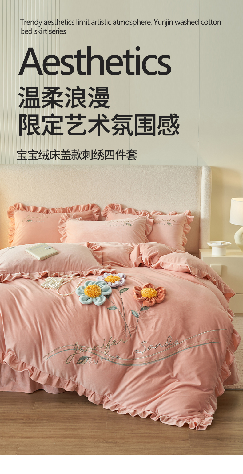 (总)恒爱家纺 2025新款牛奶绒贴布绣夹棉床裙四件套,豆沙红,浪漫紫,天空蓝,温馨粉,象牙白