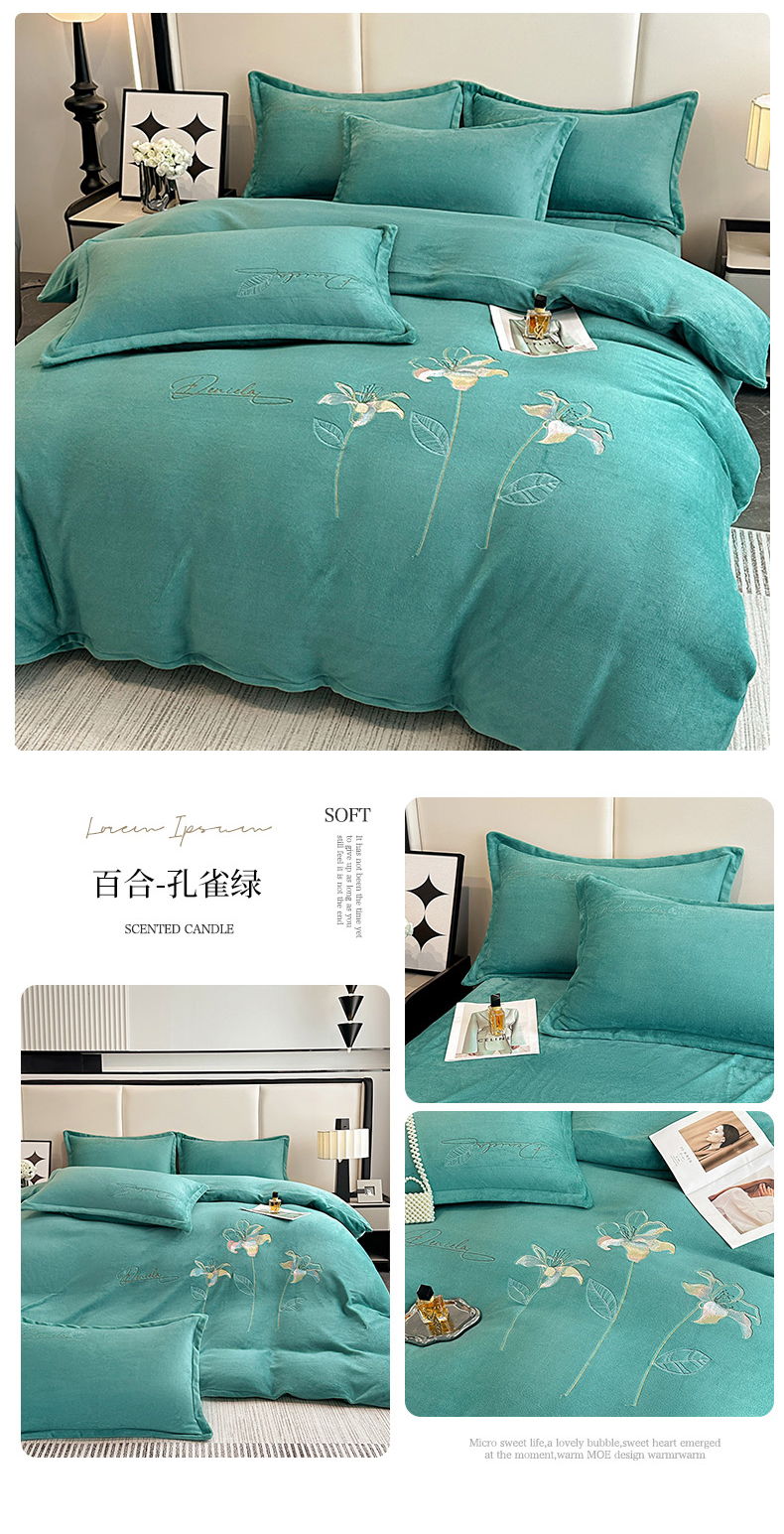 陌乘坊家纺 2024新款高克重牛奶绒刺绣四件套-百合系列 百合-孔雀绿