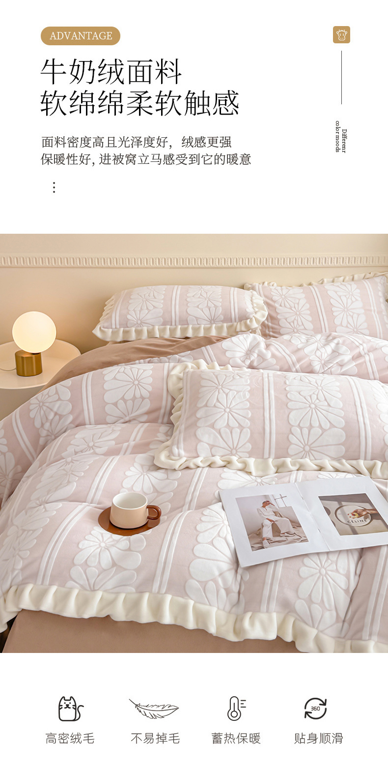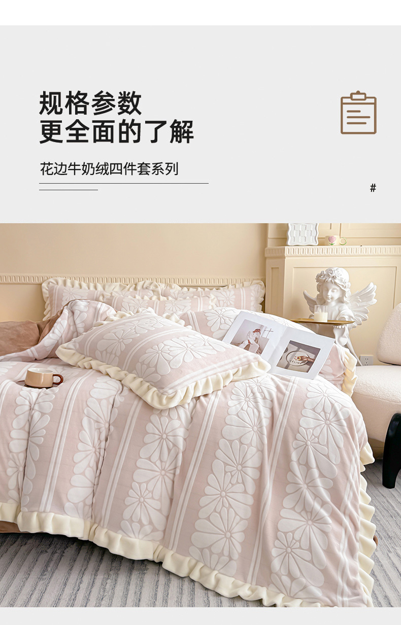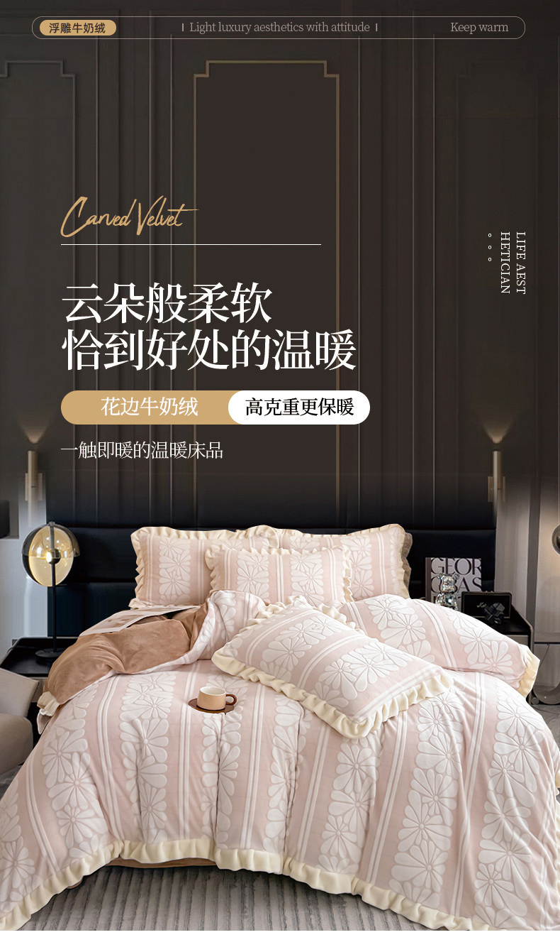 (总)KA家纺 2025冬季高克重绣花雕花牛奶绒四件套,相约奶昔白,相约粉,相约绿,相约蓝