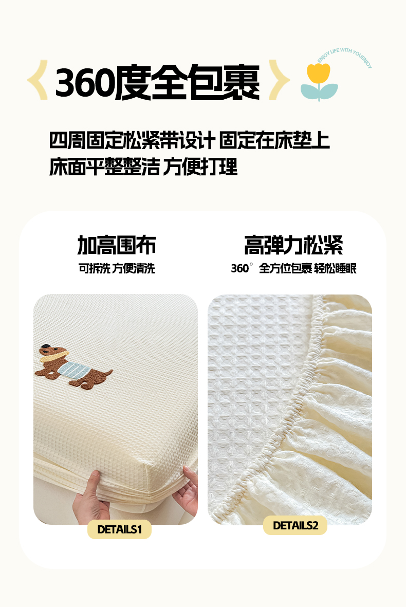 (总)居眠 2026新款全棉印花华夫格床笠,彩带条,花眠,条纹粉,细灰条,小斑点,小樱桃,樱桃小象,月亮星星,组合叠拍图