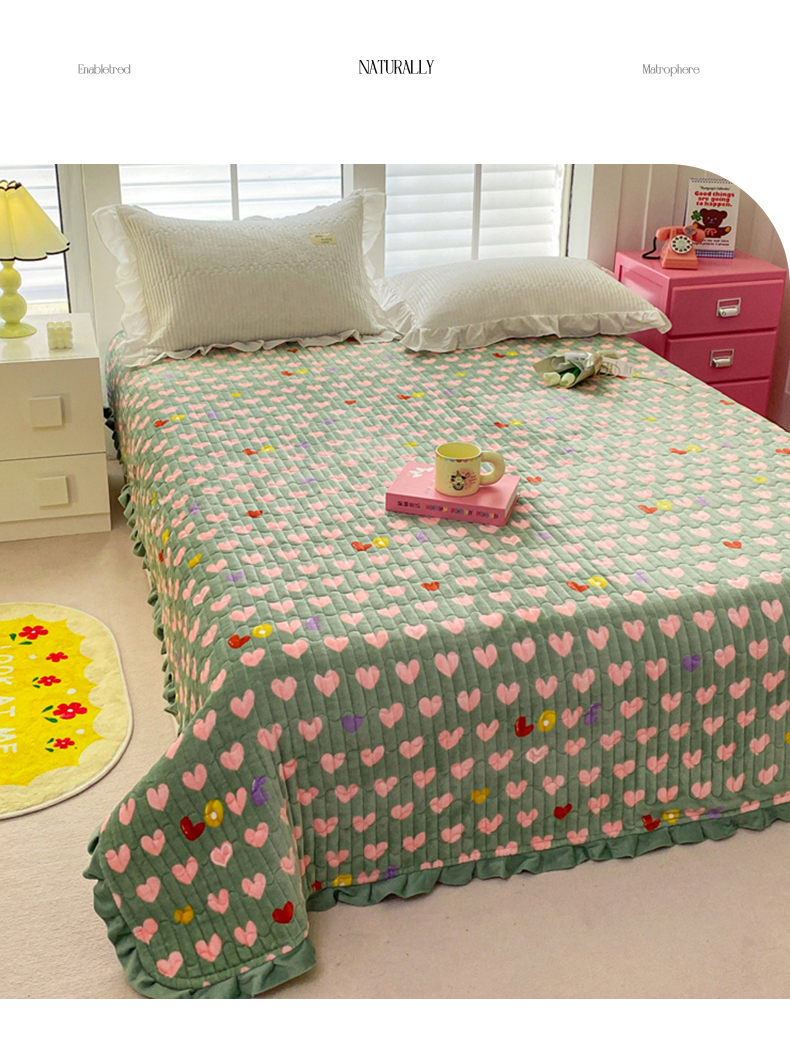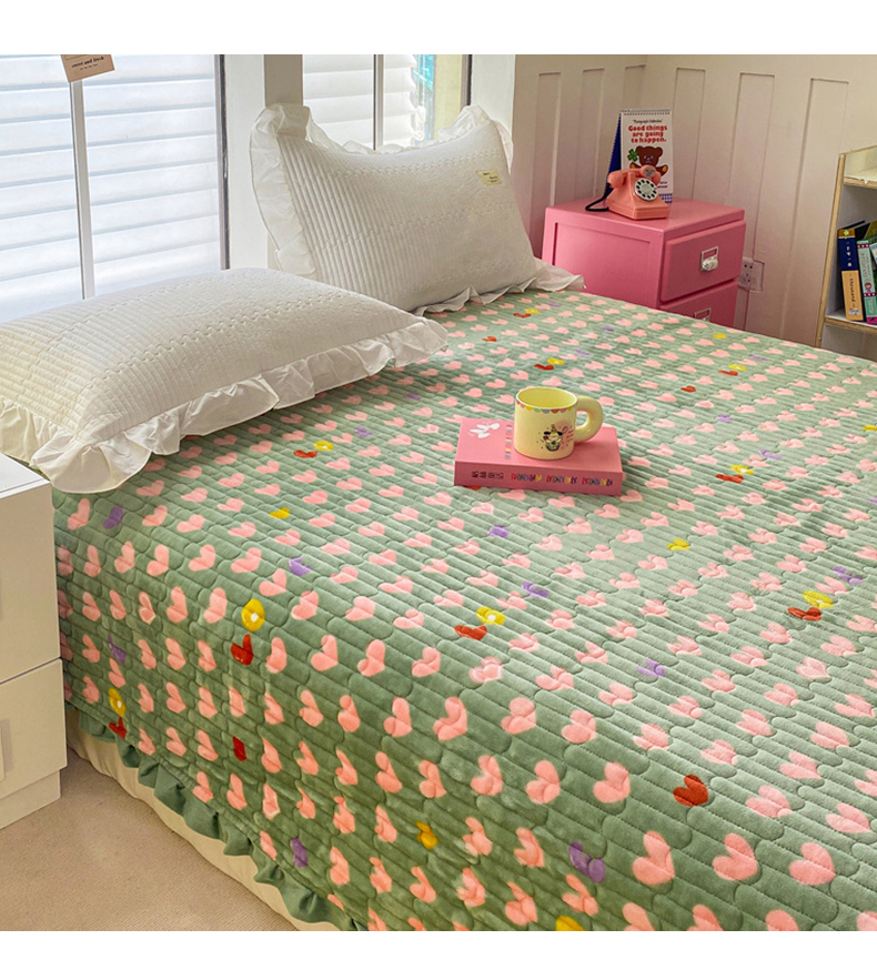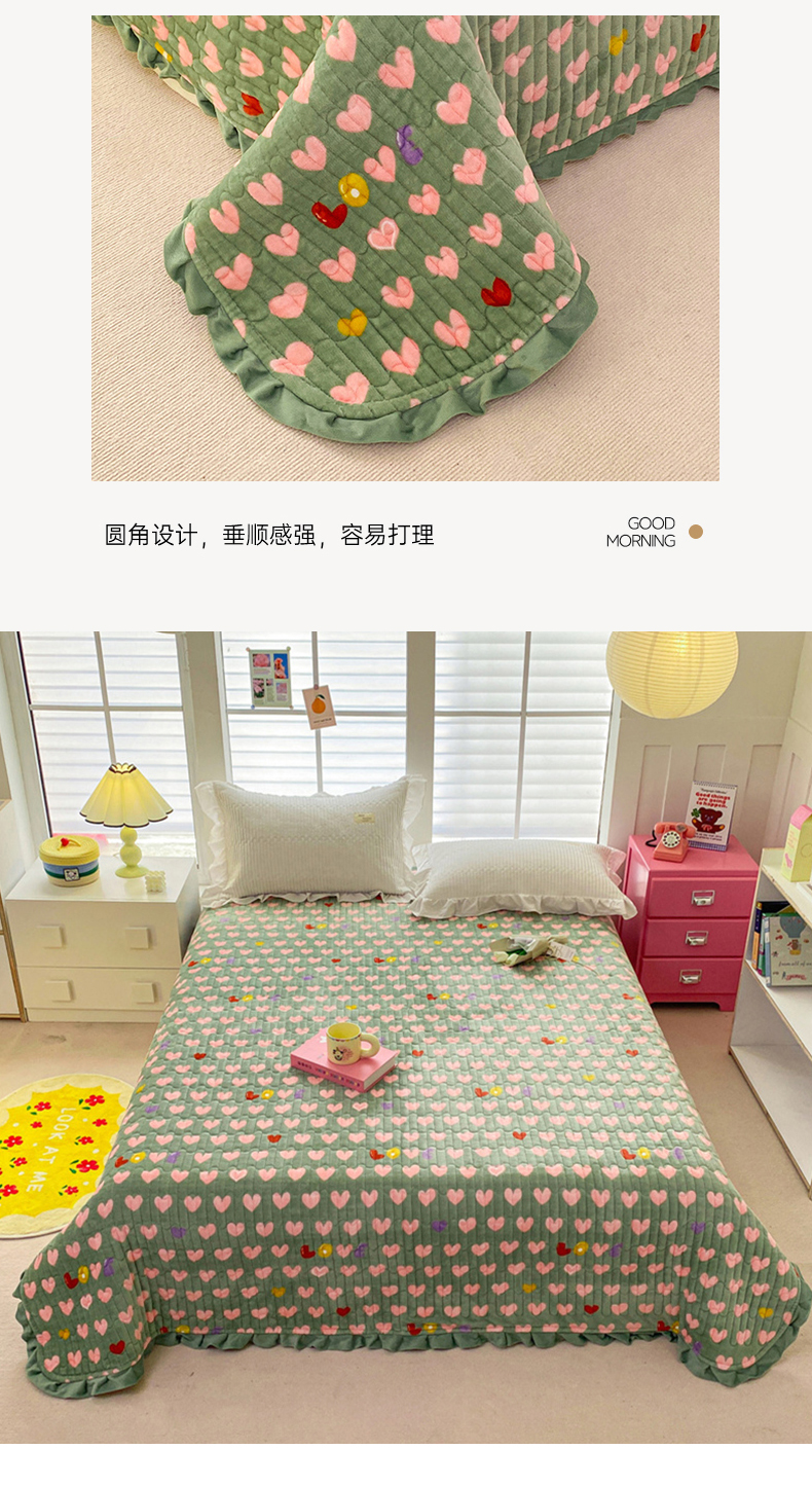 胜权家纺 2024秋冬新款印花牛奶绒加厚保暖圆角花边夹棉床盖 多彩爱心绿