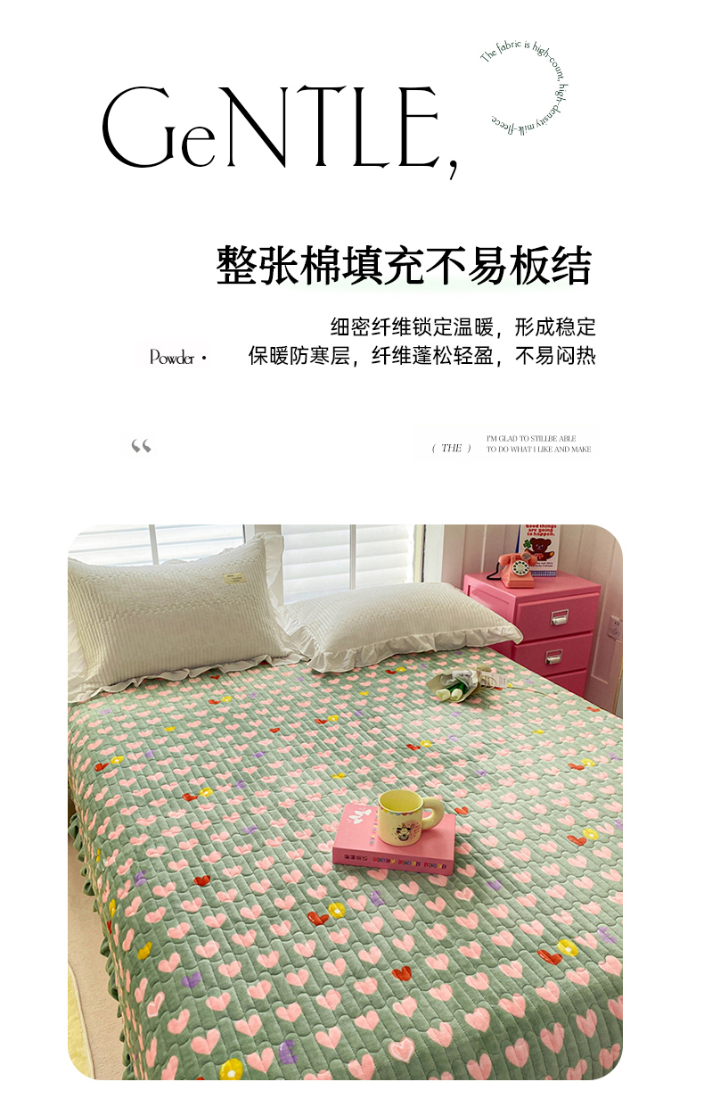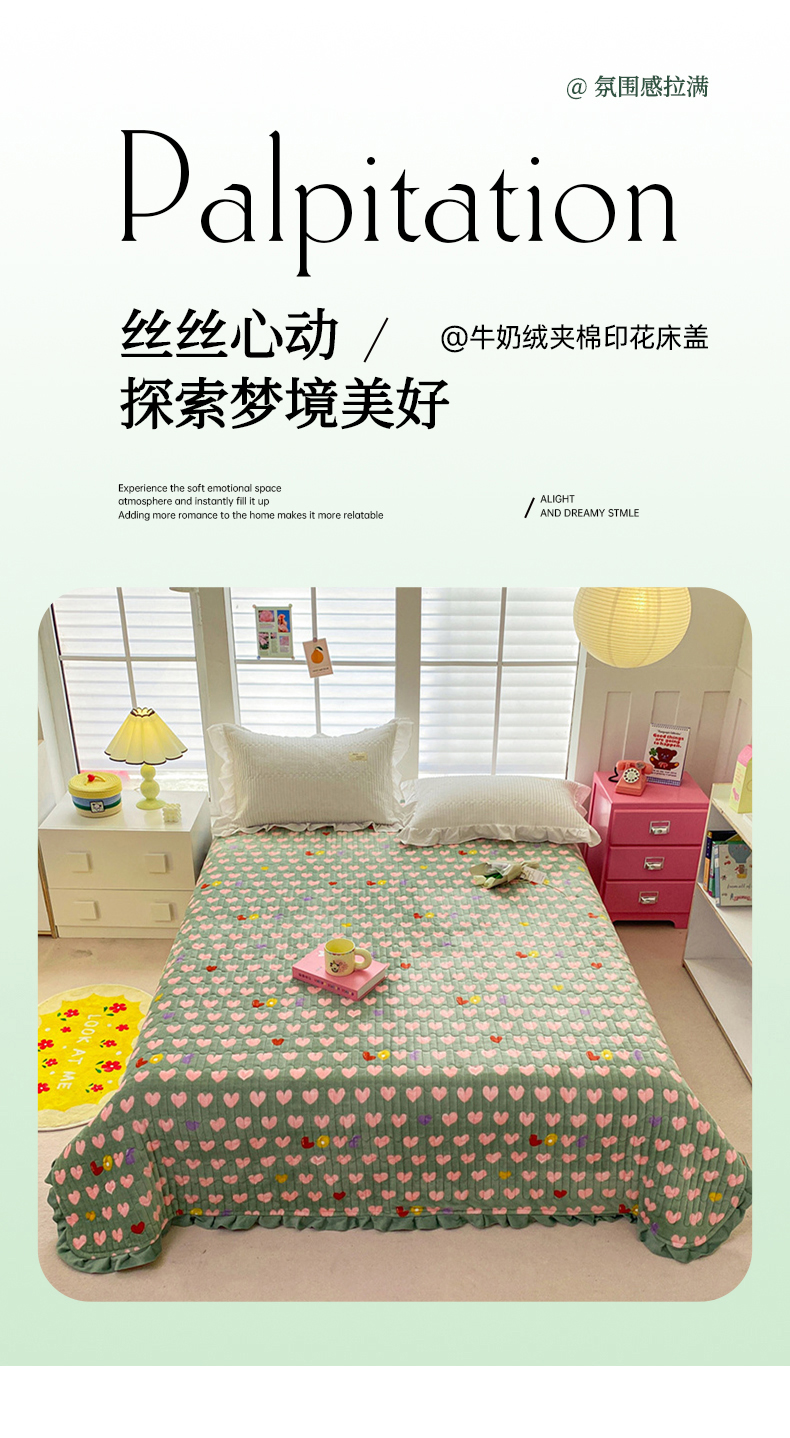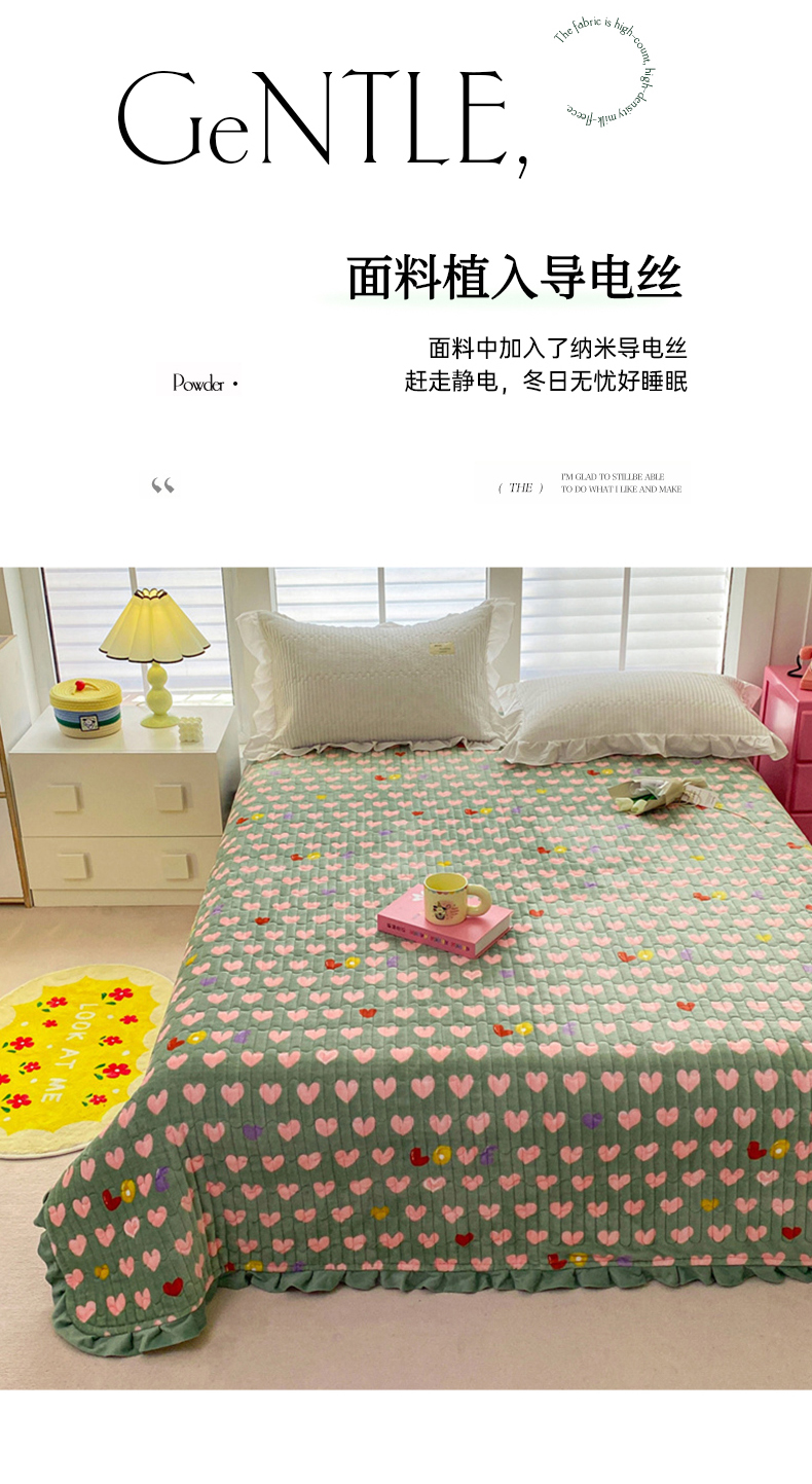 商品名称:胜权家纺 2024秋冬新款印花牛奶绒加厚保暖圆角花边夹棉床盖 多彩爱心绿