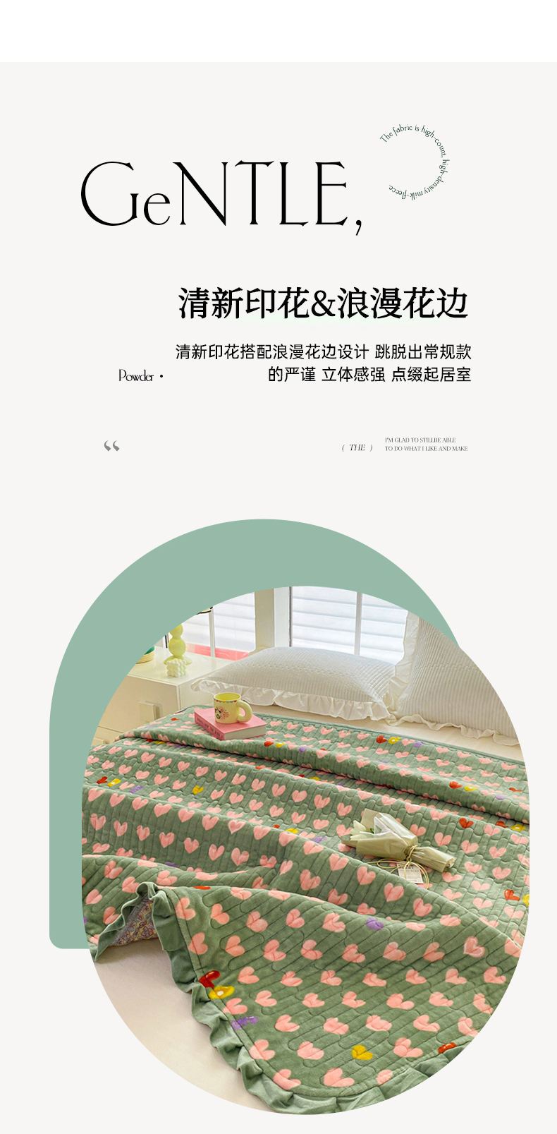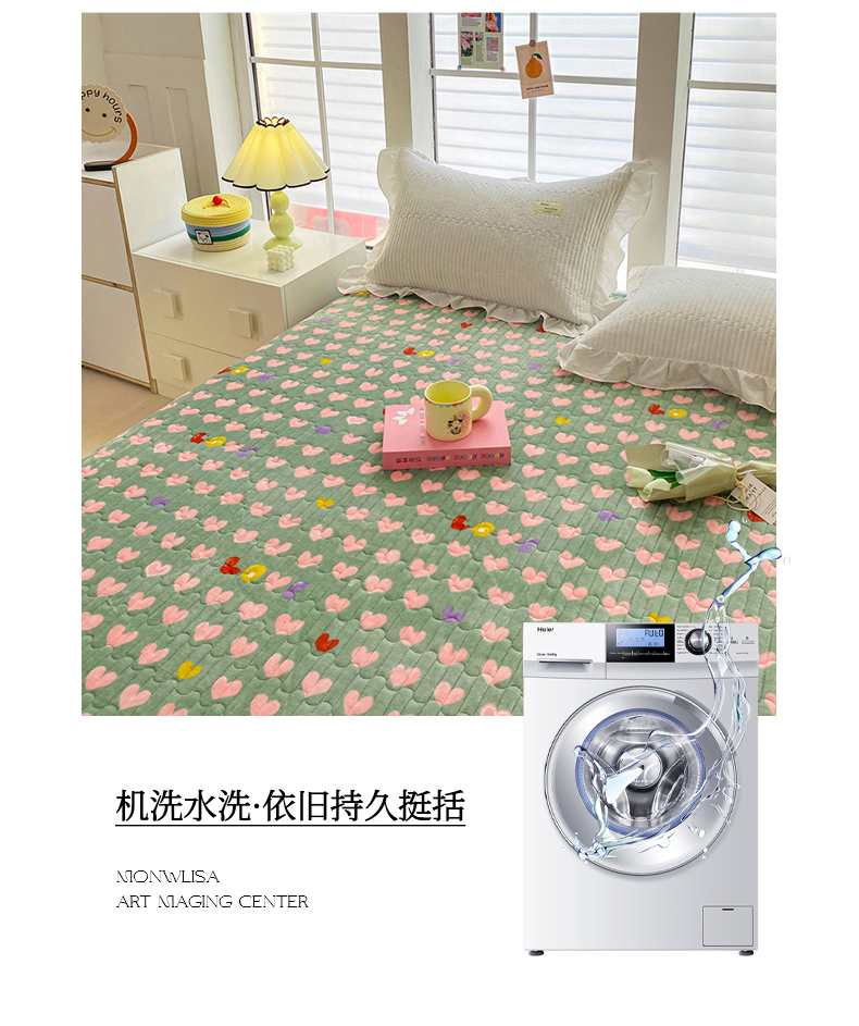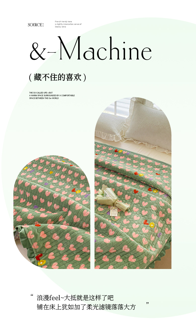 商品名称:胜权家纺 2024秋冬新款印花牛奶绒加厚保暖圆角花边夹棉床盖 多彩爱心绿