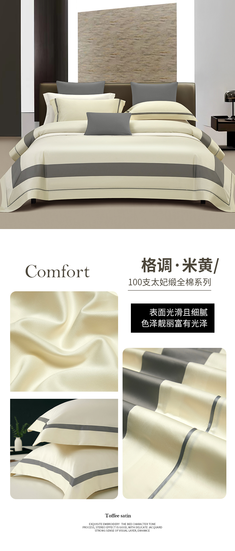商品名称:【2024更新】100支100S全棉太妃缎纯色拼色四件套可选多件套可定制 格调·米黄