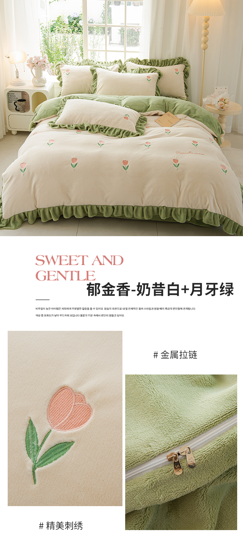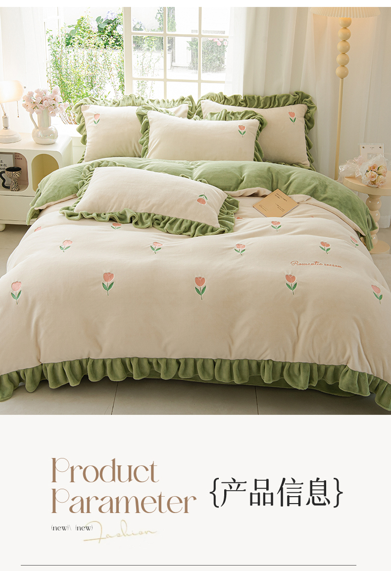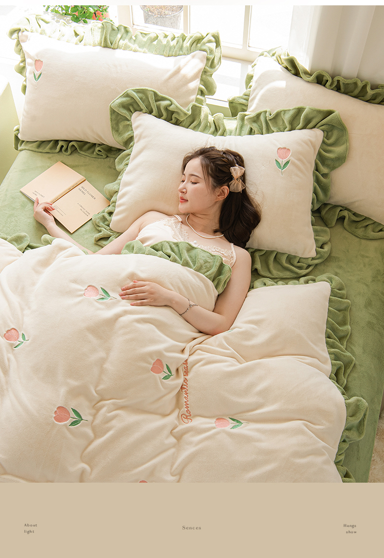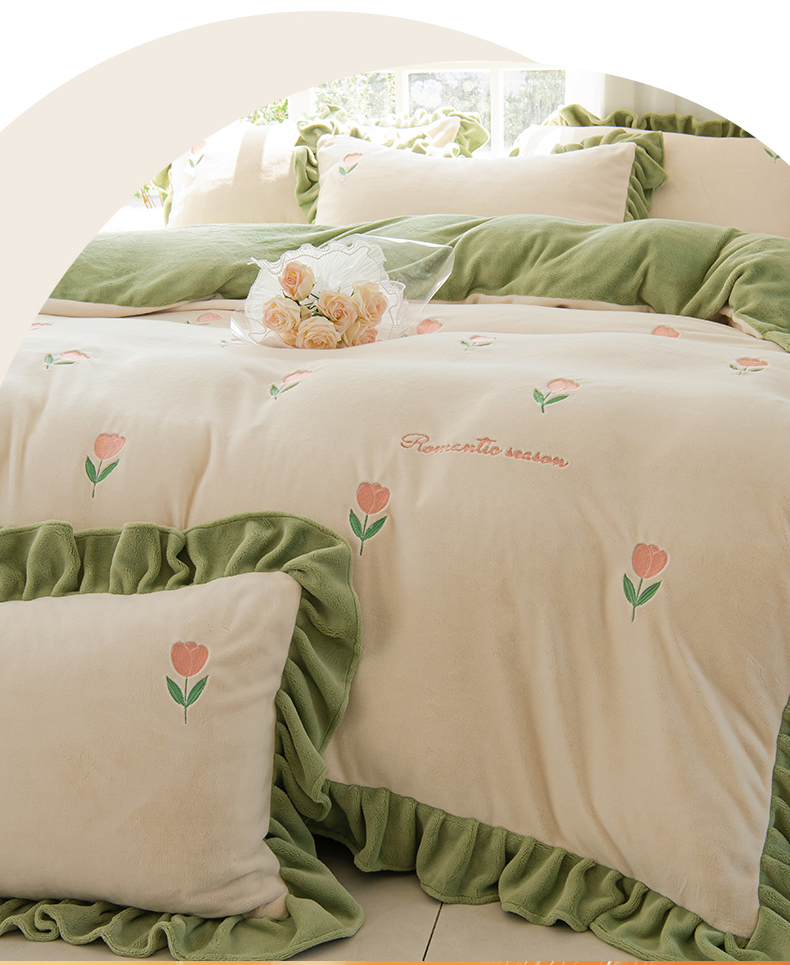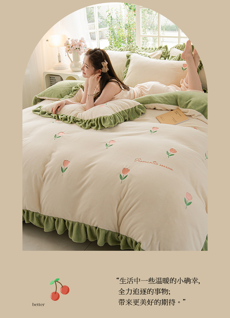 当前位置: 91家纺网 > 商品网购 > 床品套件 > 四件套 > 牛奶绒四件套 > 笙意家纺 2025新款牛奶绒花边郁金香花卉樱桃刺绣四件套 郁金香-奶昔白+月牙绿
